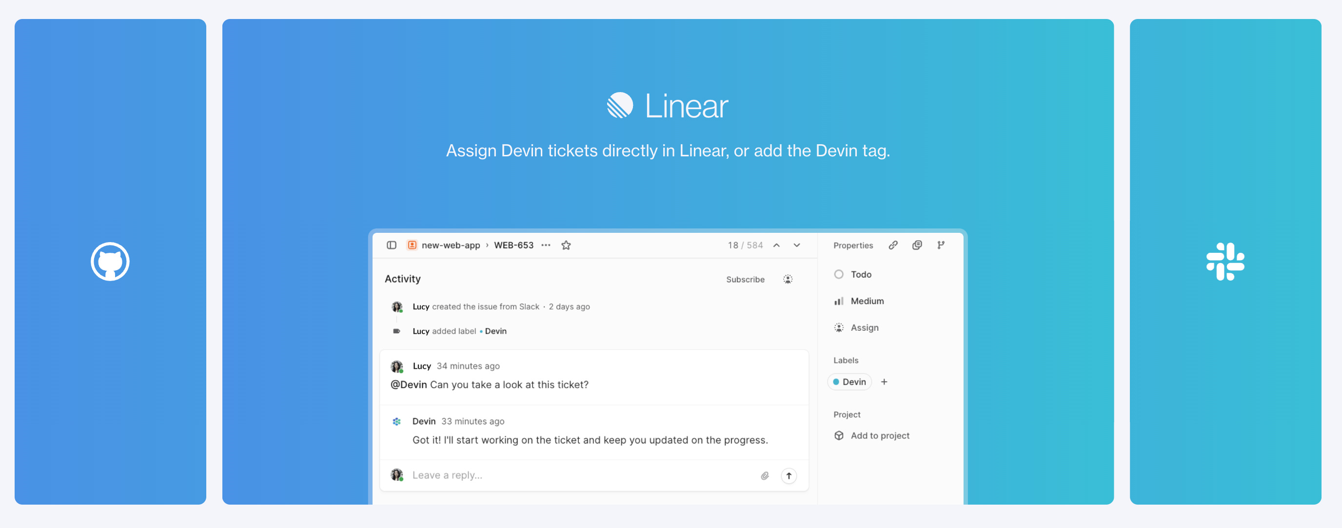 Devin is an autonomous AI engineer. You assign it bugs, features, or complex refactors through Slack, Linear, Jira, or its website. It writes the code, then sends you a pull request to review.