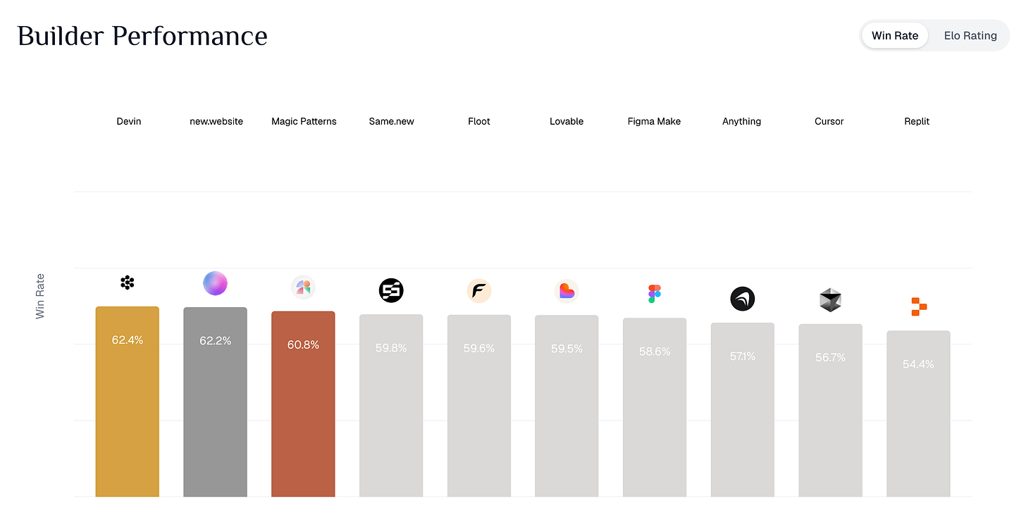 Devin ranks #1 in the Builder Arena, ahead of Cursor, Lovable, Replit, and Figma Make—a benchmark based on thousands of people blindly comparing the output of each AI’s product being given the same prompt.