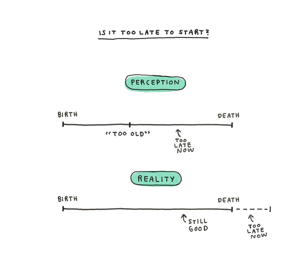 Be the adult leaving your piano lesson as a first grader is arriving. Be the youngest person at your rec centerâs water aerobics class. Itâs never too late (or too early). You might discover youâre great at something you didnât know about. Or even better, you might have a blast. The juicy new neural pathways in your brain will thank you.