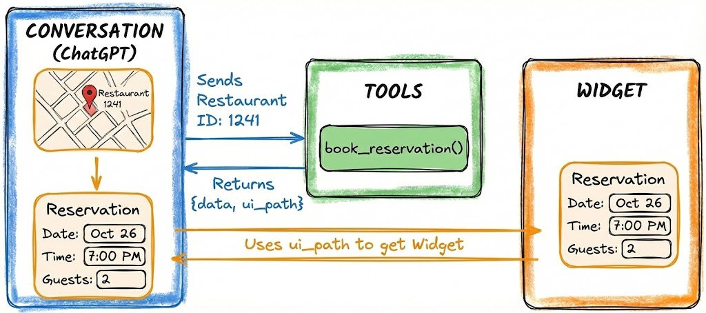 The user interacts with the widget—say, by clicking on a restaurant to reserve it. That click can trigger a follow-up tool call. Your widget then sends a message back to ChatGPT saying, “User selected restaurant_id: 1241,” and ChatGPT can call another tool, like book_reservation(), to save their reservation. The conversation continues, with the widget and the AI working together.