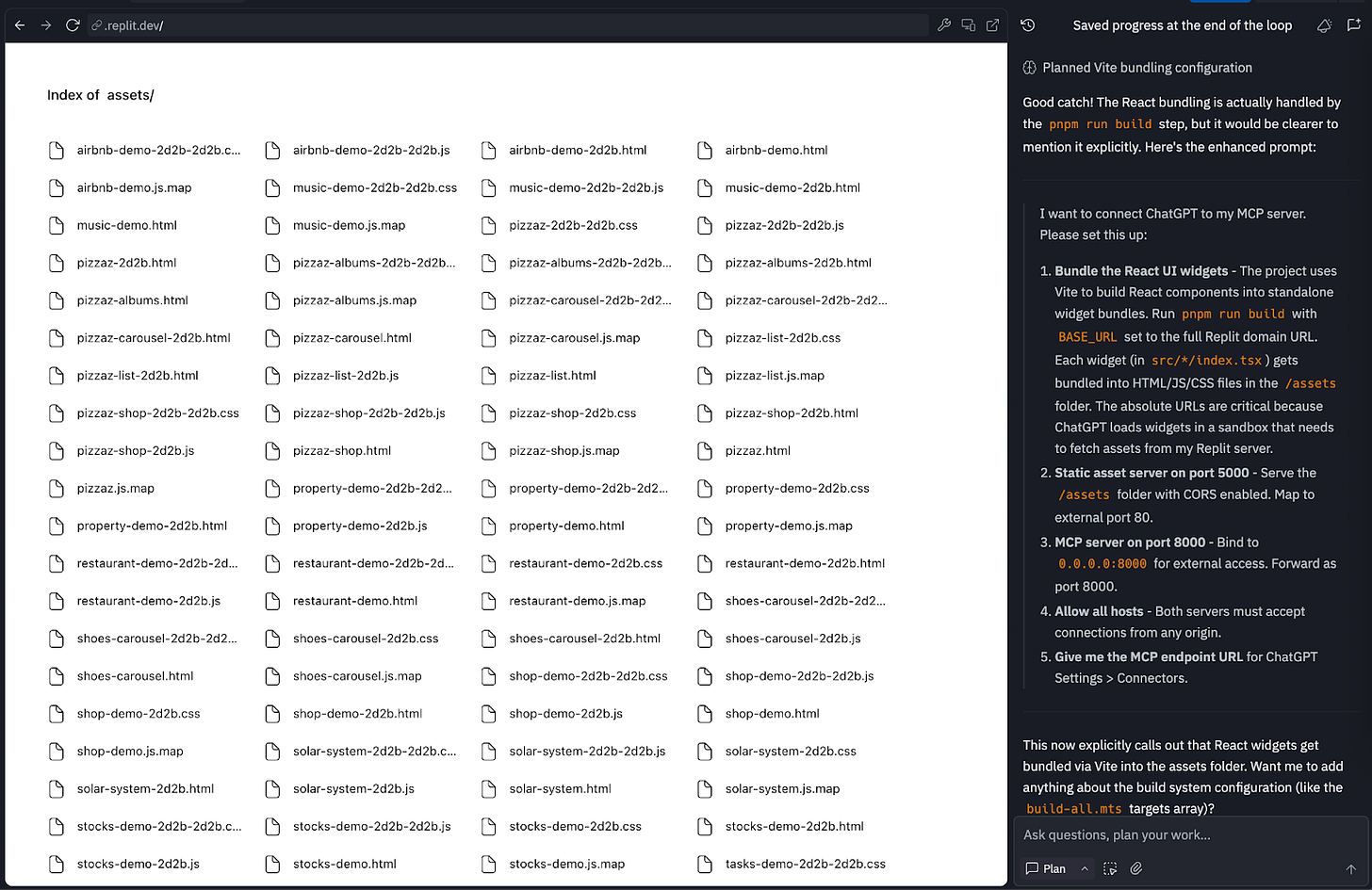 Bundle the React UI widgets - The project uses Vite to build React components into standalone widget bundles. Run pnpm run build with BASE_URL set to the full Replit domain URL. Each widget (in src/*/index.tsx) gets bundled into HTML/JS/CSS files in the /assets folder. The absolute URLs are critical because ChatGPT loads widgets in a sandbox that needs to fetch assets from my Replit server.