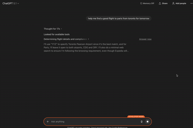 Now you can say, “Help me find a good flight to Paris from Toronto,” and an interactive widget appears directly inside your conversation. You browse flight options, compare prices, and book, all without ever leaving the chat.