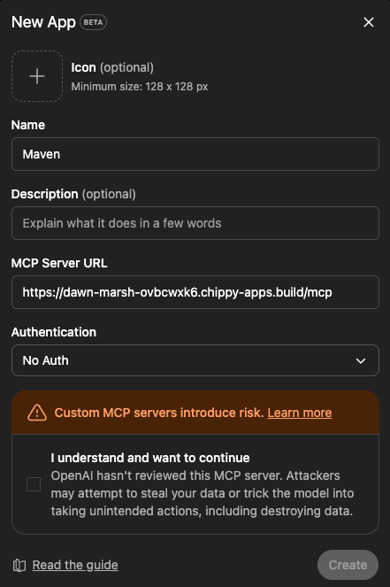 Add a Name, MCP Server URL, and set Authentication to No auth. Once you click Create, you’ve successfully made your first ChatGPT app!