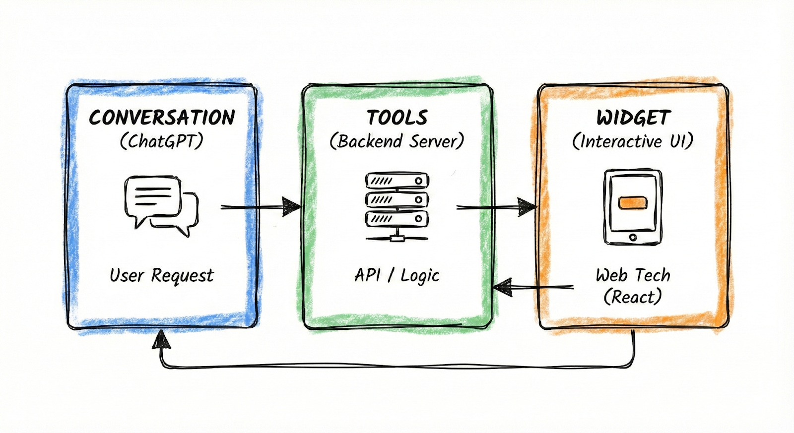 The user-facing widget: This appears in the user’s chat, built with web technologies (typically React) and runs in a secure sandbox inside ChatGPT.