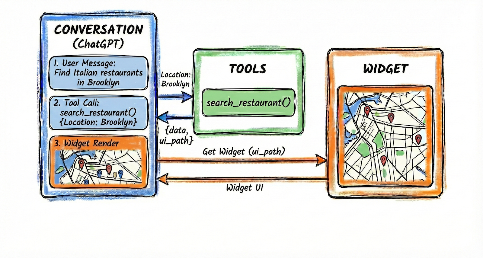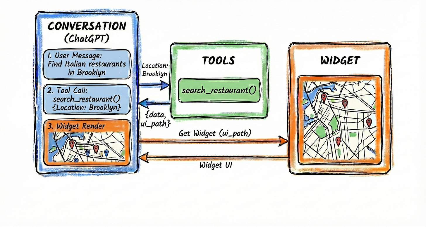 Here’s the flow: The user says, “Find me Italian restaurants in Brooklyn.” ChatGPT looks at the available tools, sees one called search_restaurants with a description like “Search for restaurants by location and cuisine” and calls it with {location: “Brooklyn”, cuisine: “Italian”}. Your server runs the search, returns the results, and can optionally include a widget to display them. ChatGPT renders the widget in the chat with the user.