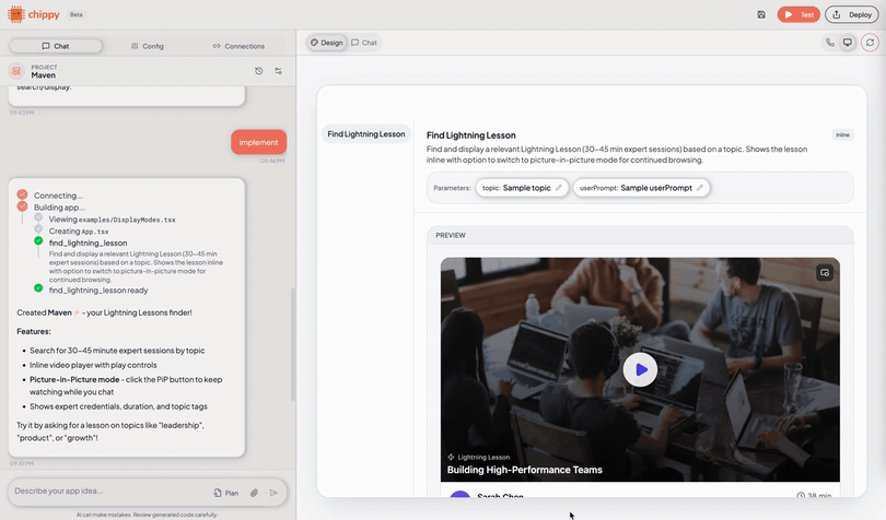 To start, I’ll head to Chippy.build and ask Chippy to help me plan this project. Chippy suggests a single tool called find_lightning_lesson that takes a topic as input. It will then show an inline card to start, with an option to change to picture-in-picture.