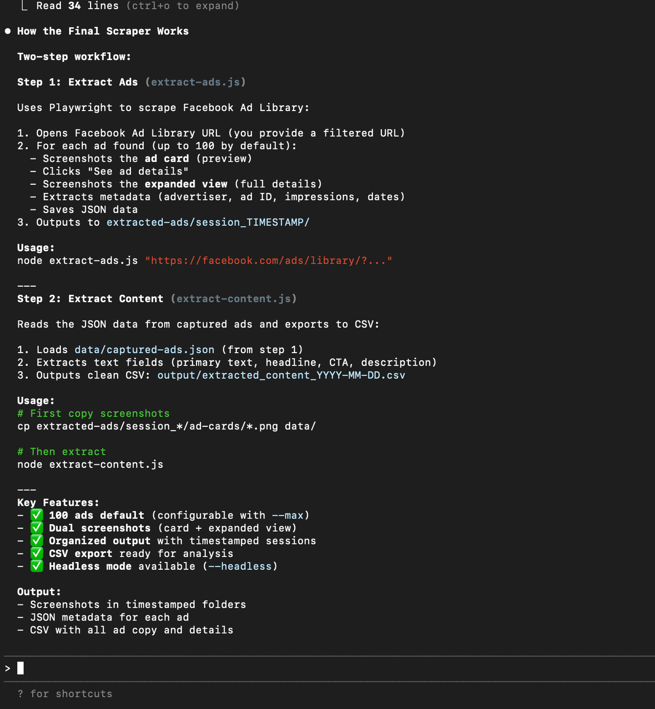 “Extract ads from competitors to find the problem, use case, or copy/asset that’s working for them, and then repurpose it for my ads. Claude Code built out these scripts that would screen-grab all ads running on the ad library, and it’s super cool to watch it navigate to the browser and grab all screenshots in an almost ‘agentic’ way.”