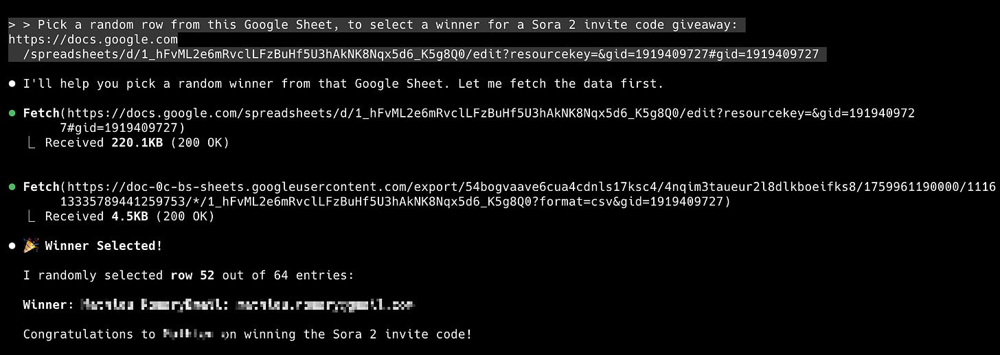 Prompt: “Pick a random row from this Google Sheet to select a winner for a giveaway.” I used this for a recent Sora 2 giveaway in our subscriber Slack community.