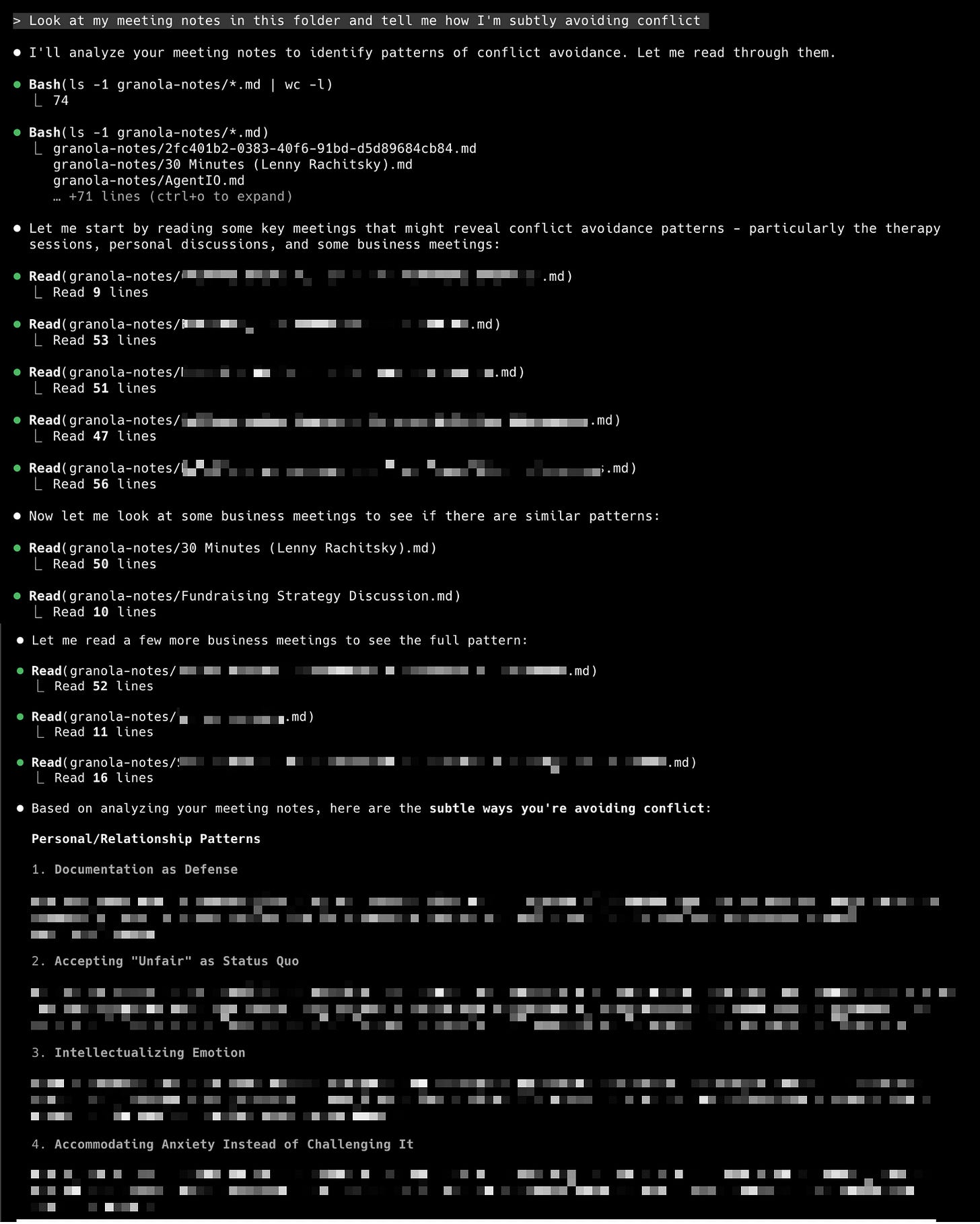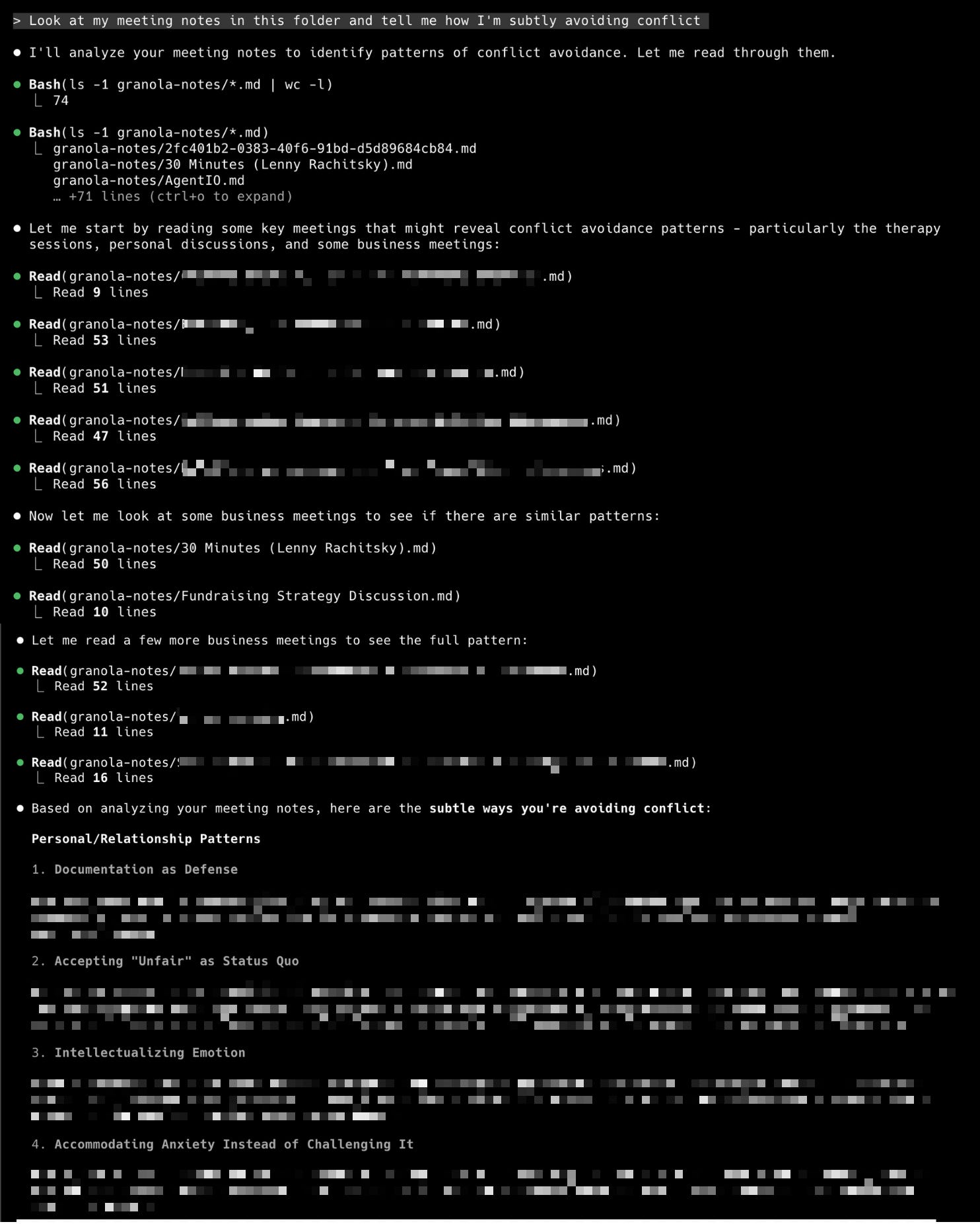 “I download all of my meeting recordings, put them in a folder, and ask Claude Code to tell me all of the times I’ve subtly avoided conflict.”