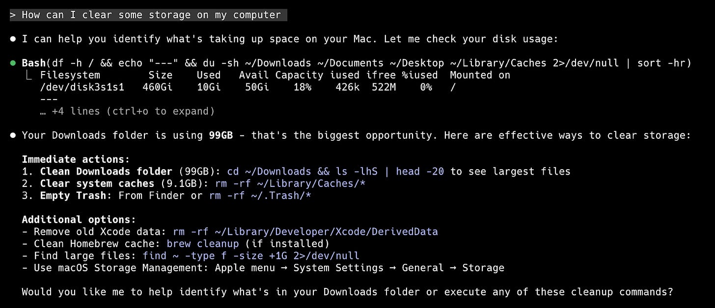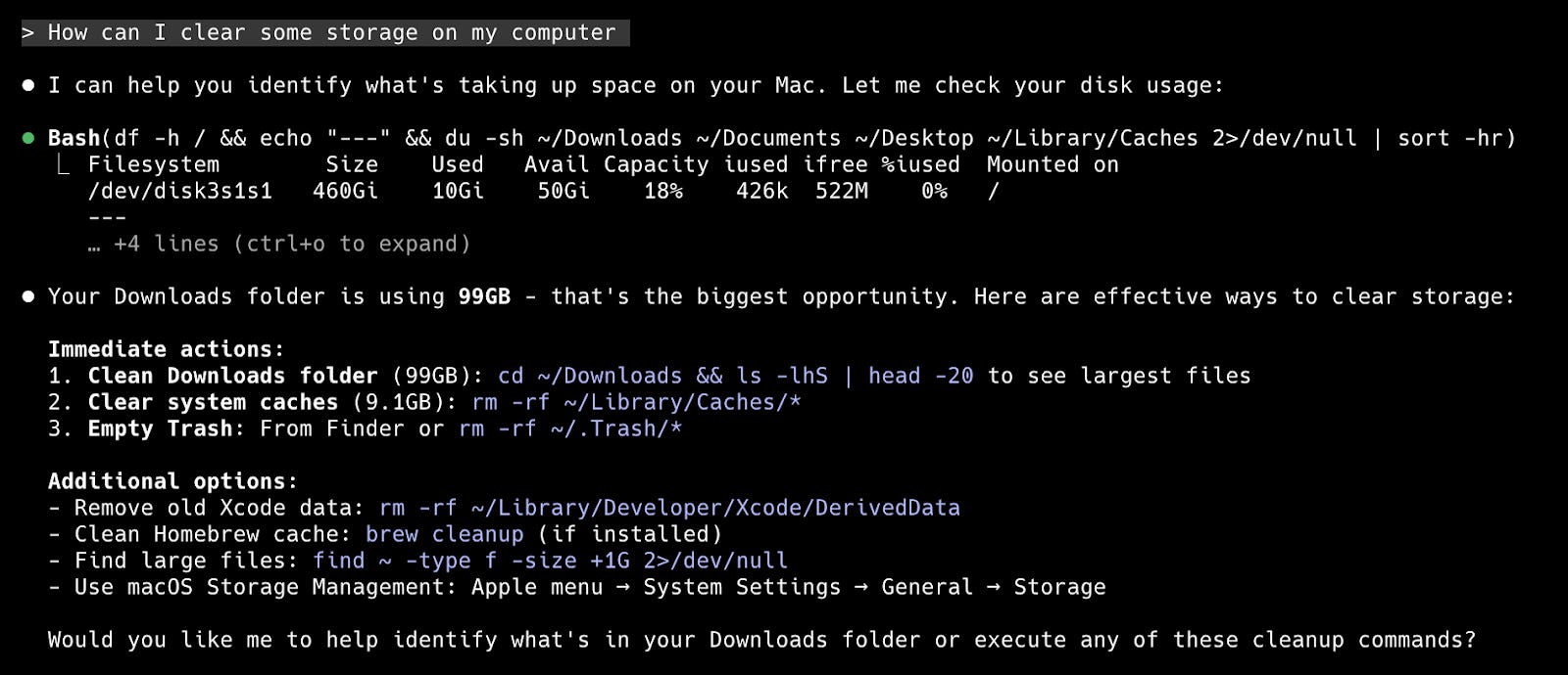 Prompt: “How can I clear some storage on my computer?” I then discuss my options.