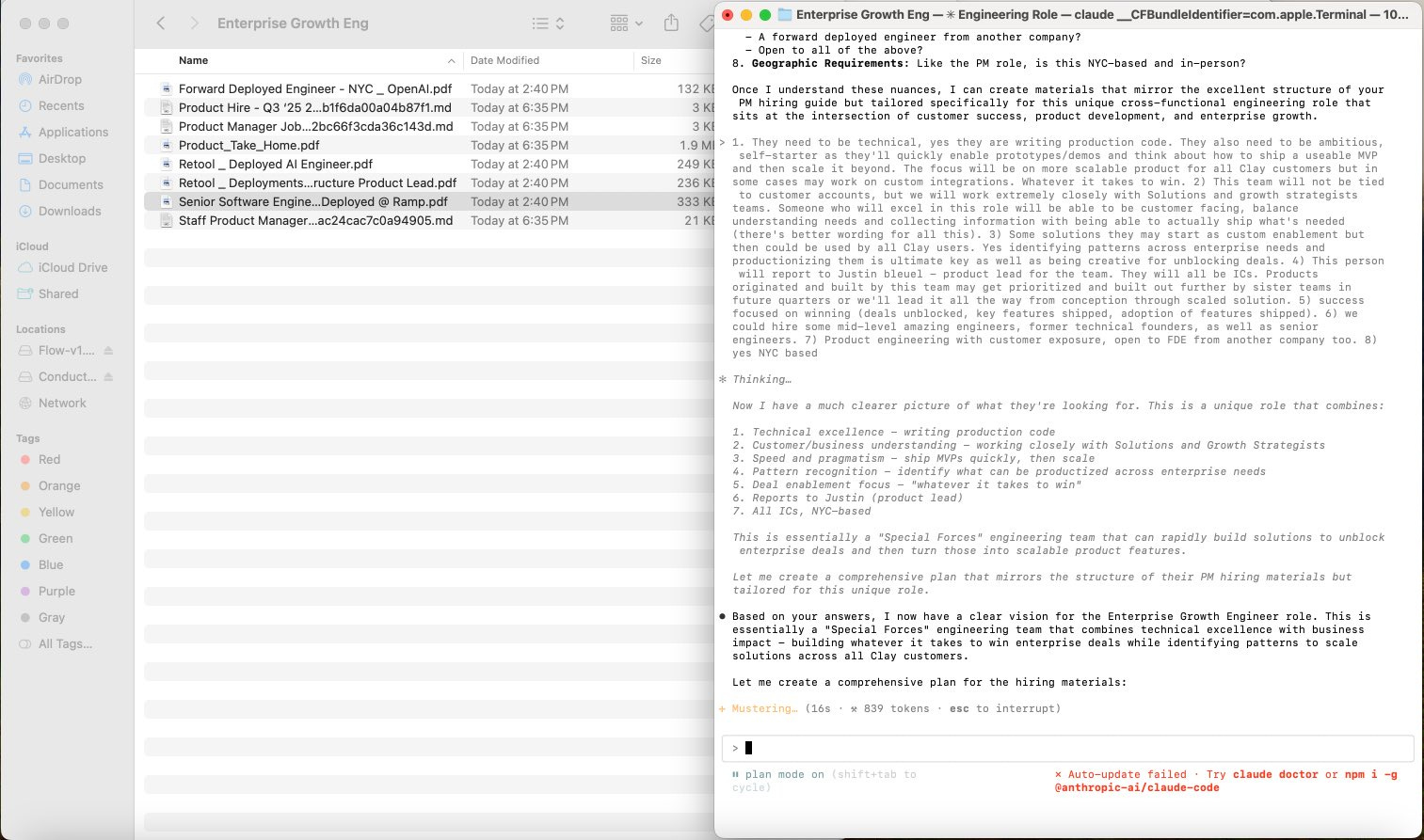 I made a folder with internal Notions of our hiring material for PMs, added similar role JDs from other companies, then in planning mode asked to generate the same collateral for this new role.”