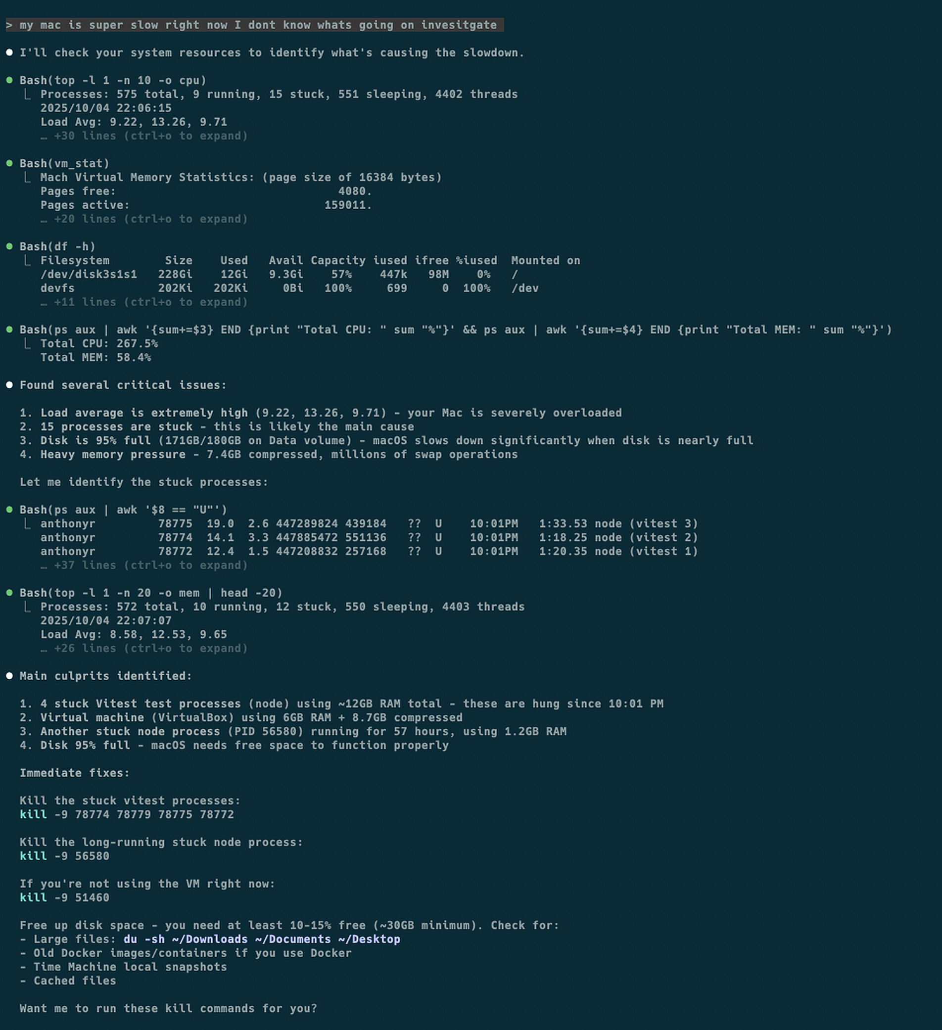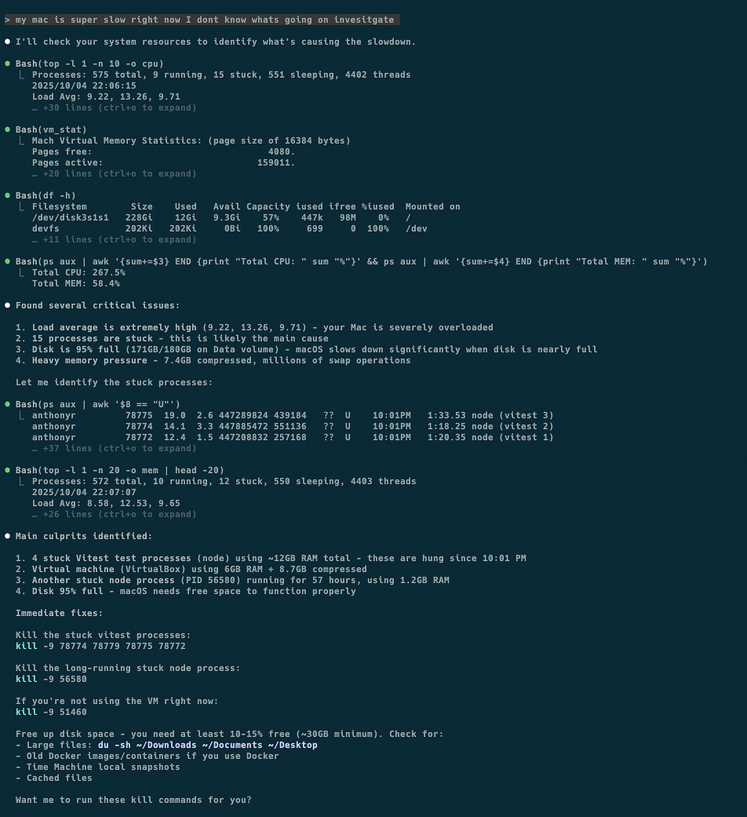 I use it to check load averages, memory pressure, disk space, stuck processes, and swap activity, then it dives deeper to find what’s actually causing issues. It can calculate cache sizes, check Docker usage, find Time Machine snapshots eating space, etc.