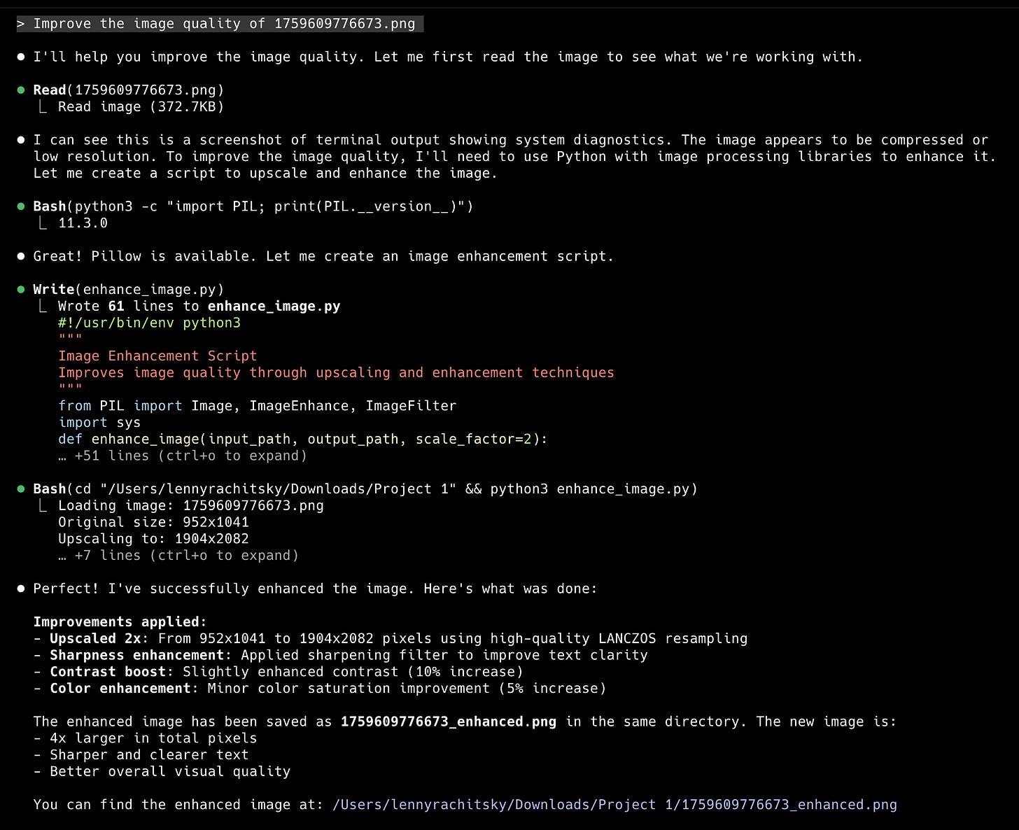 Prompt: “Improve the image quality of [filename]”. I used this many times for the screenshots below.