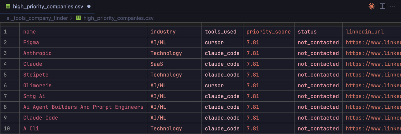 “My product masks sensitive data in code assistant queries. So Claude Code proposed the idea to find potential leads in the GitHub repos, by searching for the actual sensitive values in them (and whether in the repo we see some evidence of using coding agents). This was actually genius—not only does it filter out a lot of companies, but it also provides instant value to the lead. Here’s what it came up with: repos list, priority score, even LinkedIn URL.”
