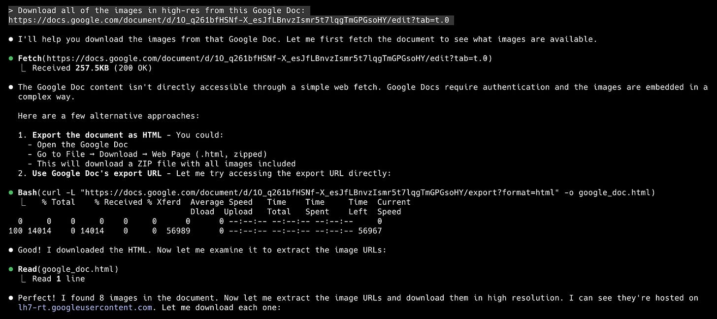 Prompt: “Download all of the images in high-res from this Google Doc: [URL]”. This paired well with item #2.