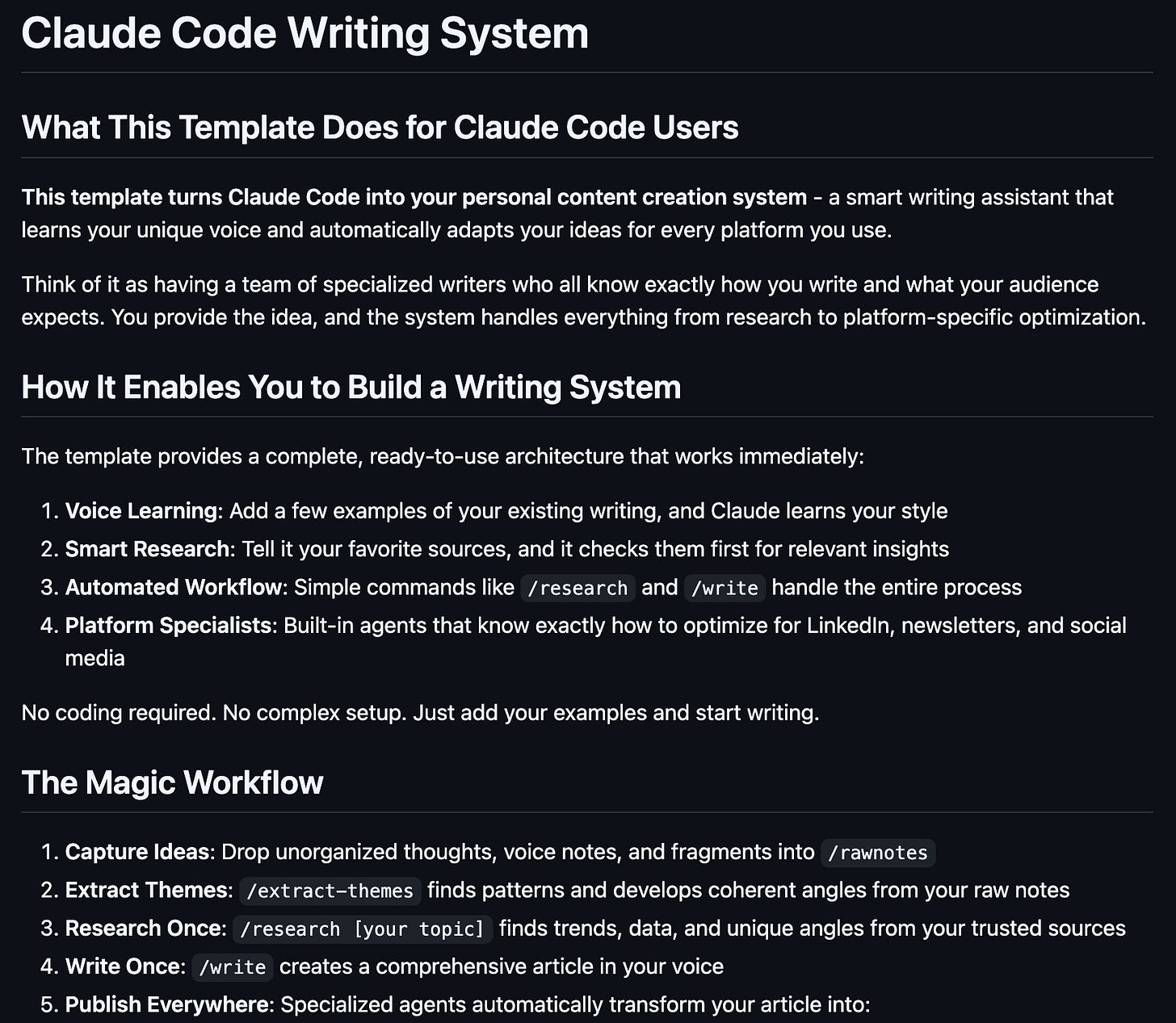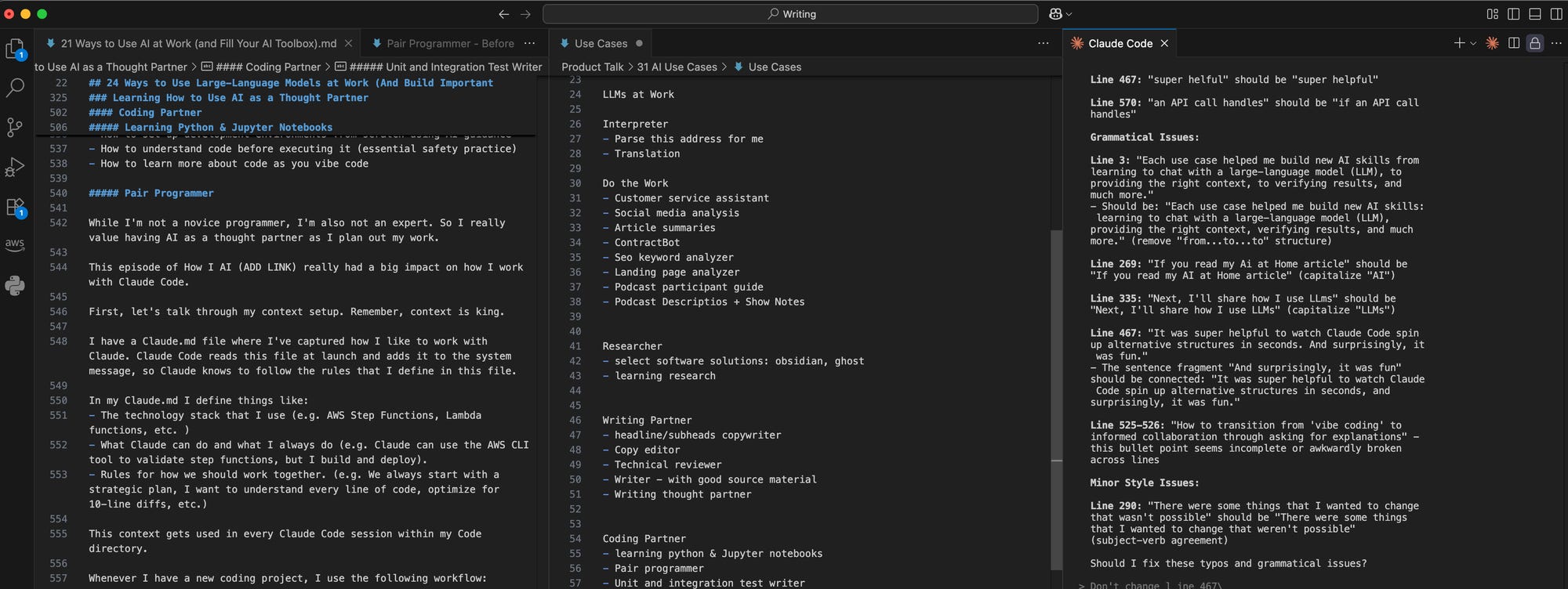 “I now write all of my content with Claude Code in VS Code. We iterate on an outline, it helps me improve the hook, it conducts research for me and adds citations to my outline, and it reviews and gives feedback on each section as I write. It has completely changed the way I write.” [Much more on Teresa’s process here]