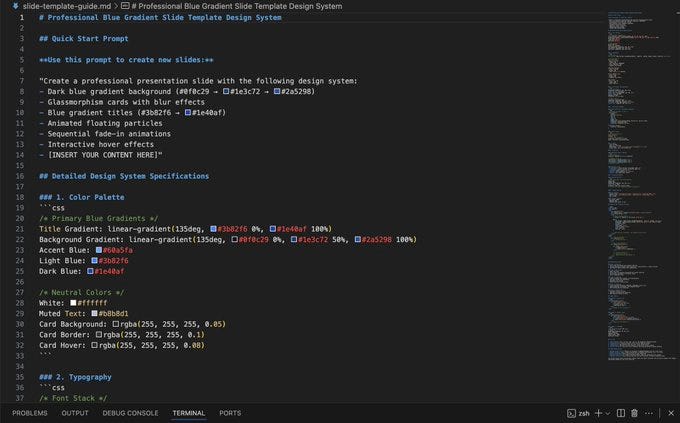 This template becomes an .md file (I’ve put a snippet of that file below). With html you can be extremely specific—‘change this wording to say that’—and then you can use an MCP to view the ‘slides’ to show what you mean as well for greater context. With this, I have added several more slides as well as changed others using the template to keep things the same. Yes, hallucinations happen, that has to be accepted going in. Someone who knows what they want and can articulate what they want will not have too much trouble.