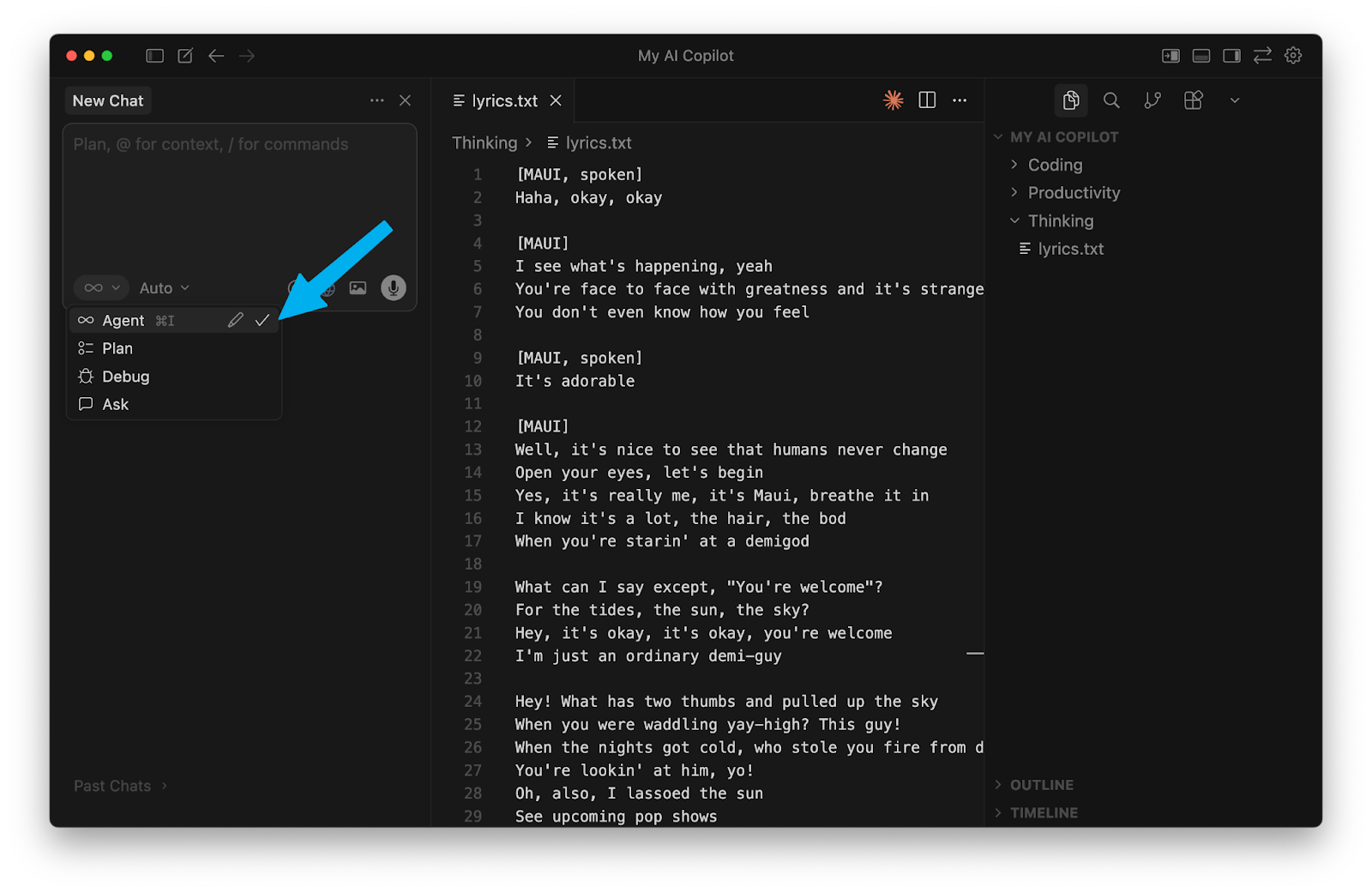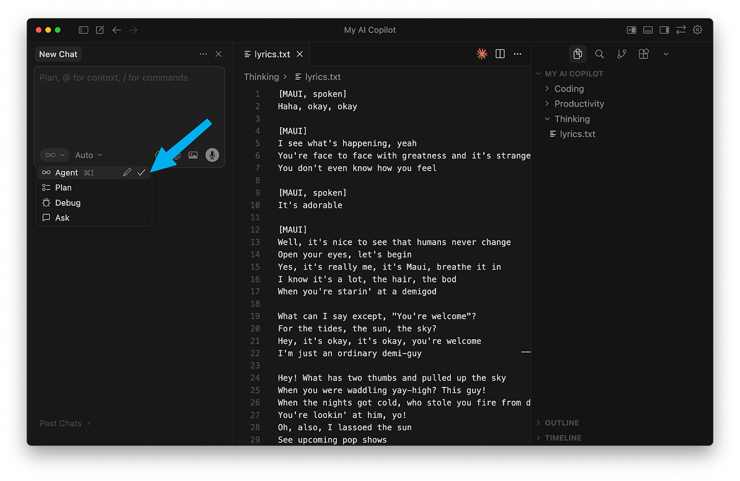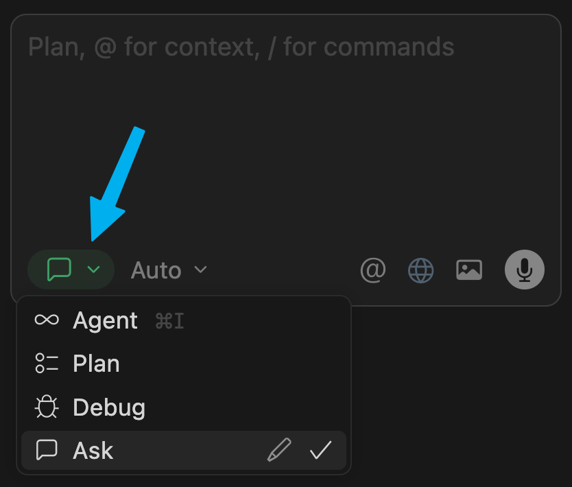 You’ll see a familiar chat box. Click on the dropdown in the bottom left corner. You can select between “Ask” mode and “Agent” mode (ignore the other options, like Plan and Debug, for now).