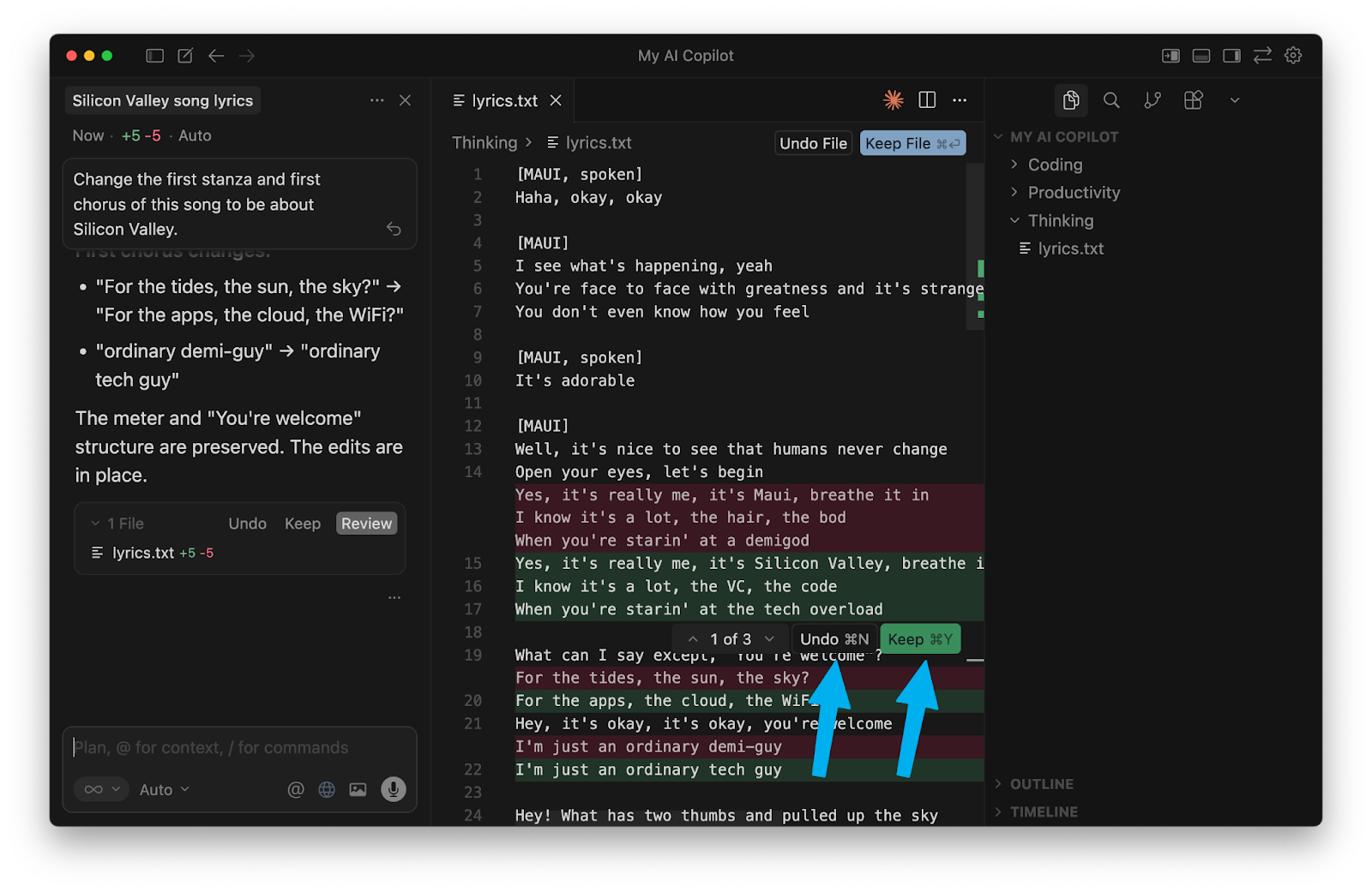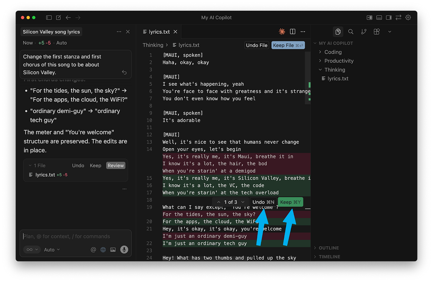 A lot just changed on our screen! You’ll notice a lot of red and green in our lyrics.txt file. Cursor modified our file. The red shows us each old line that it removed, and the green shows us the new line that it added instead.
