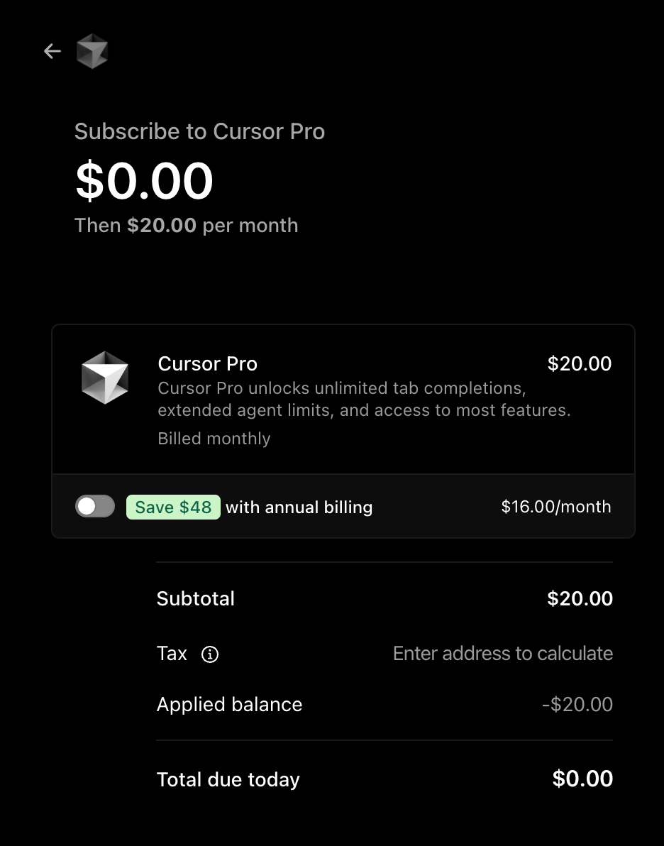 5. Once you’ve redeemed the credits, you should see this box appear in your Cursor dashboard. [If you don’t see the credits, try to hard-refresh, or log out and log back in. If that doesn’t work, shoot a message to [email protected] and mention this post.]