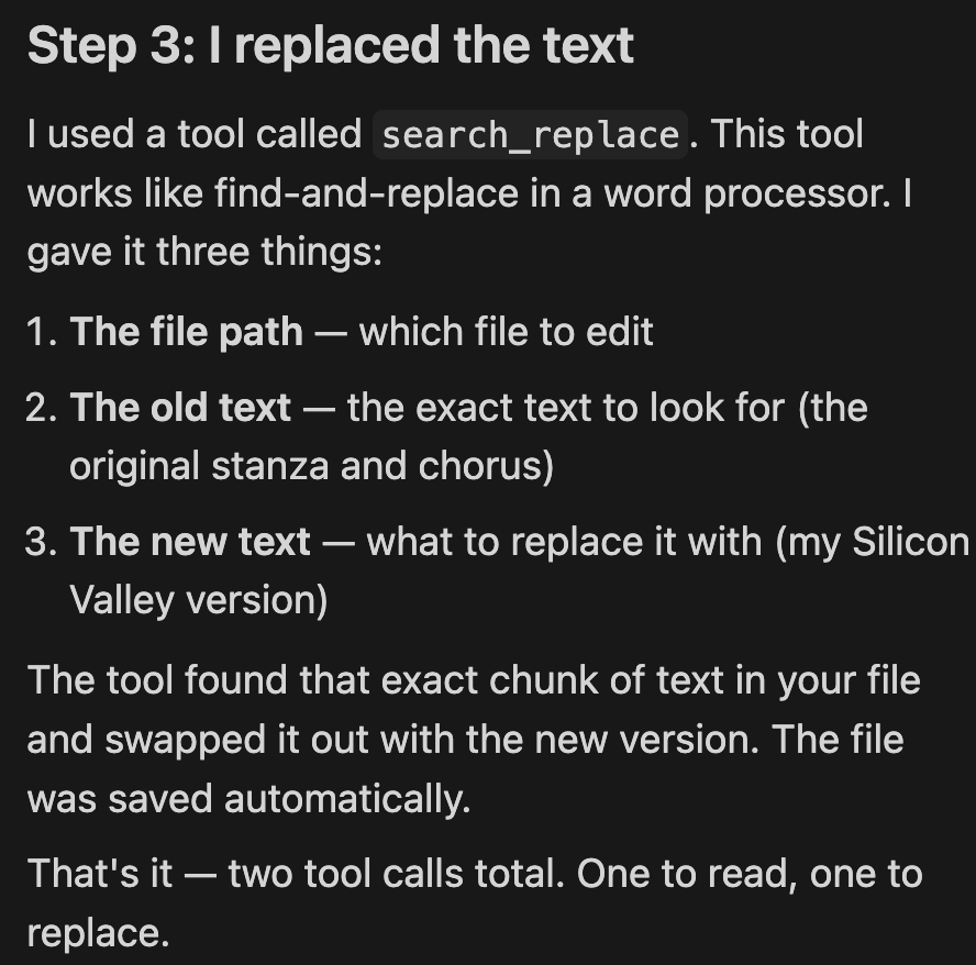 Anytime you try to use a tool of any kind, it’s going to ask for my approval, and that’s going to feel scary. So I need you to explain why you’re asking and why it’s safe to approve. It might even be a teachable moment — you can tie to the goal of the post (and where we are in the journey) that, well, you’re an agent and this is you in action!