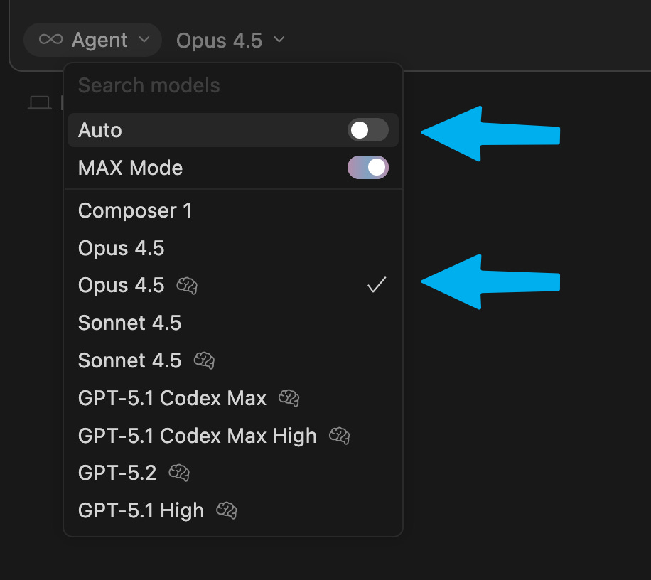 In the “model” dropdown, turn off “auto” and select Opus 4.5 🧠: