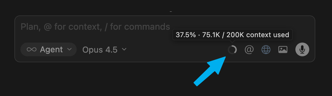 Coding agents are delightfully transparent about how much of your context window you’ve used. In Cursor, hover your mouse over the little pie chart just beneath the chat box (you might have to increase the width of the chat pane to see it).