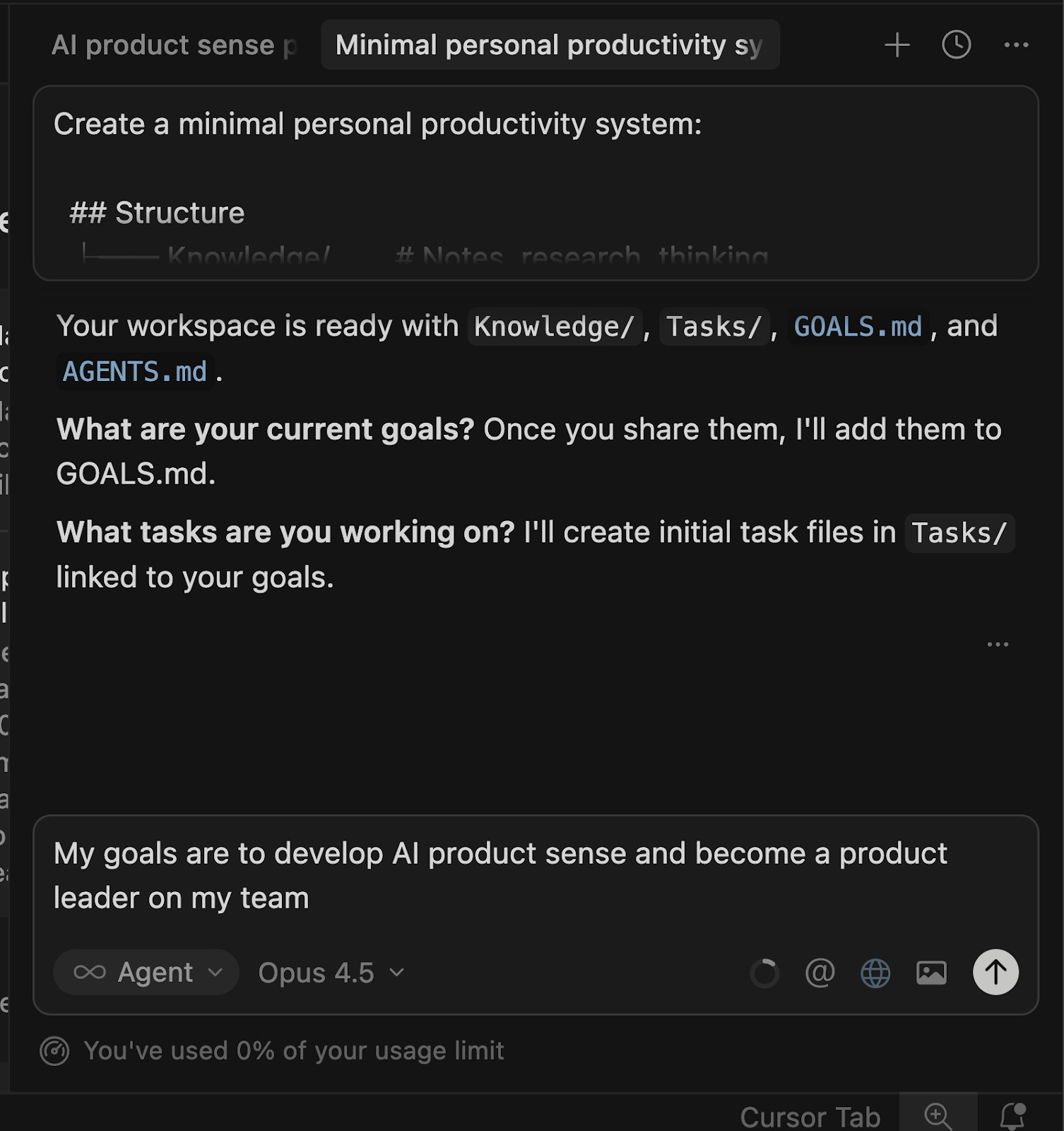 Cursor should create two directories (folder): Tasks and Knowledge. It will also create a GOALS.md file, which should be your personal goals. At this point, Cursor will ask you a couple of follow-up questions to start to populate your personal OS with context, like “What are your goals?” and “What are you working on?”
