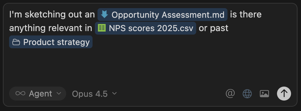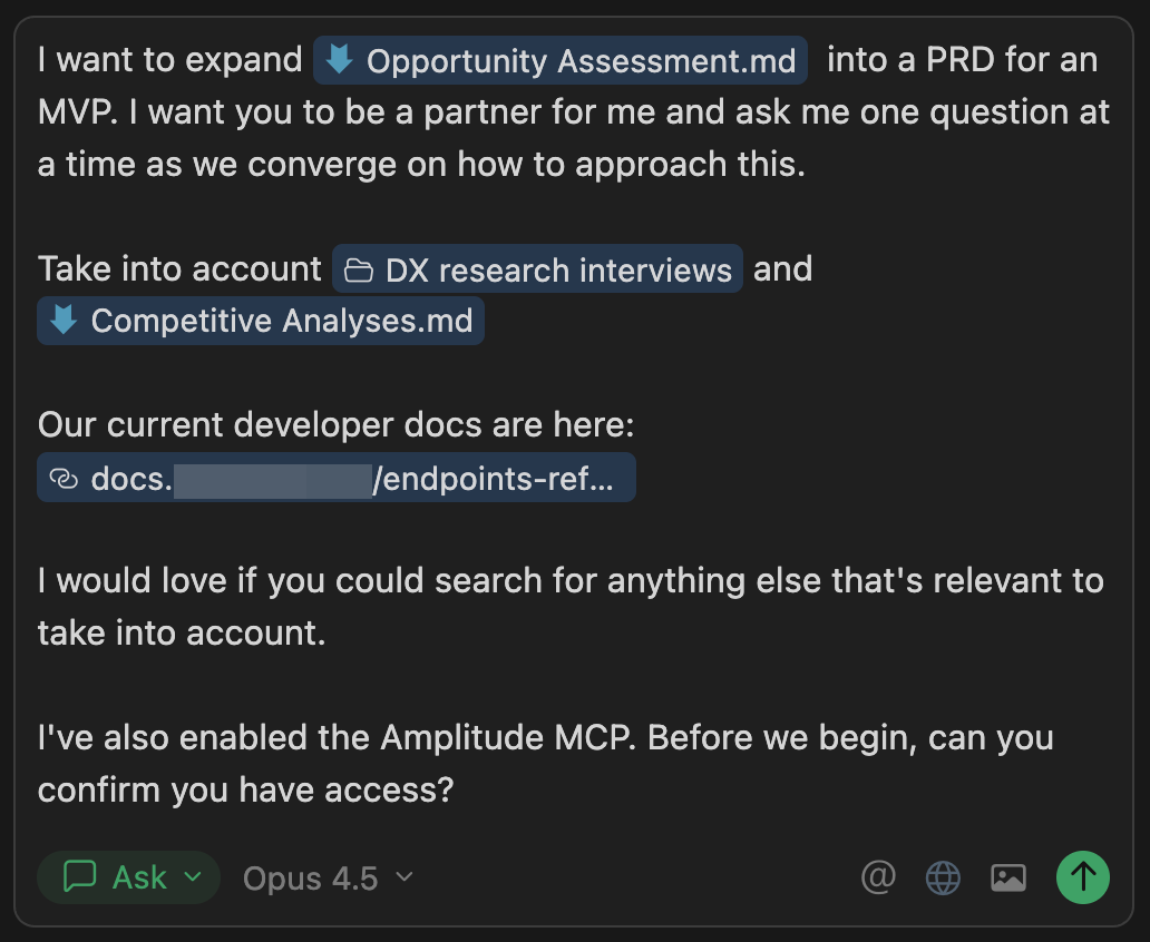 Even though you’re using Cursor instead of ChatGPT, you’ll still start each thread by asking, “What context does this conversation need?” For example, writing a PRD might start by dragging and dropping any of the following into the Cursor window: