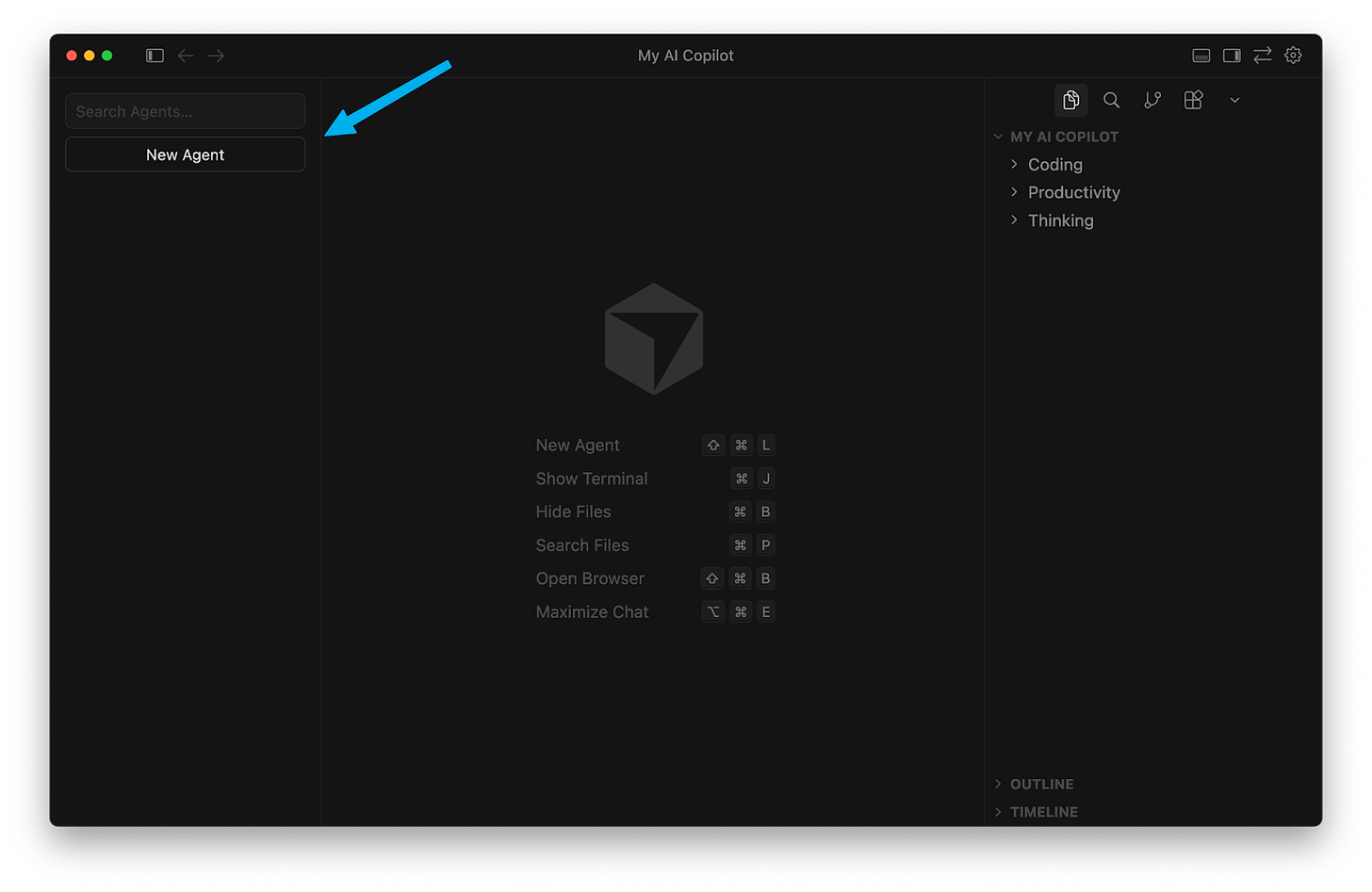 On the left, you’ll see an empty panel that will contain your agent history. Click “new agent” to start your first chat (“agent” is synonymous with “chat thread”):