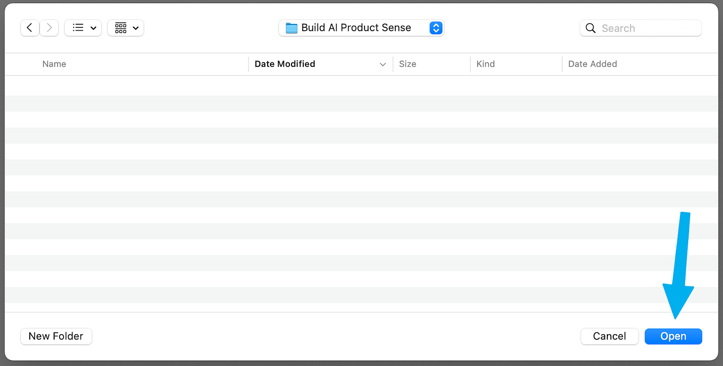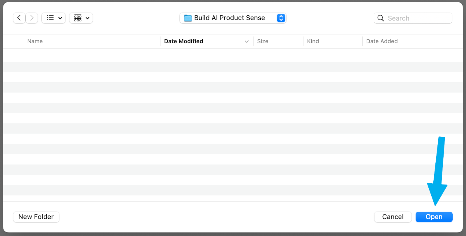 And finally, click “Open” (yes, it’s unusual to click Open on an empty folder, but just do it, it’ll work):