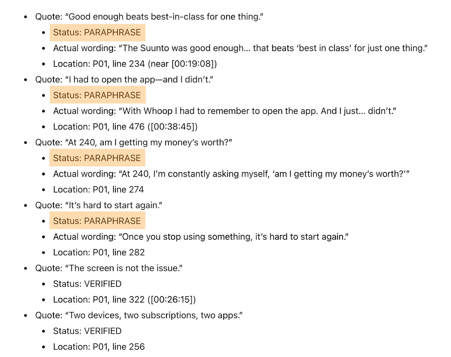 “Verbatim” is also an ambiguous word to prompt a model with. Exact characters? Can punctuation differ? What about filler words? Where does the quote start and end? The model fills these gaps with assumptions you never see. Even participant IDs and timestamps can be faked. A citation like “[P03, 14:30]” looks authoritative but means nothing if the quote is invented.