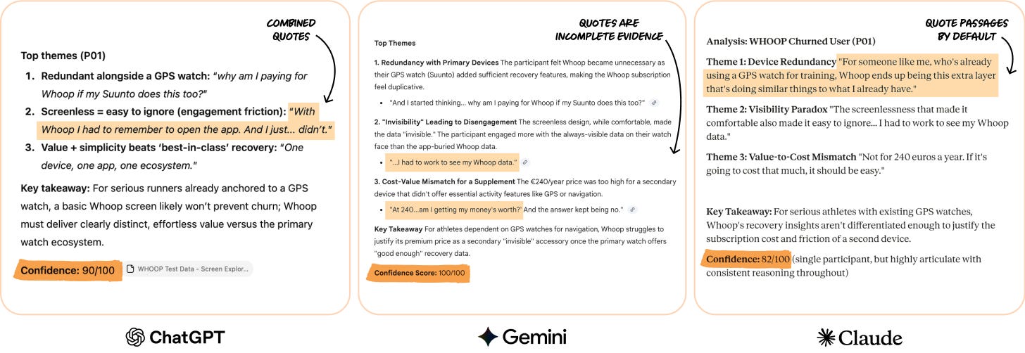 This becomes obvious when we can see all three side by side, but most teams have one LLM enterprise account and won’t see the shortcomings of the one they use. ChatGPT summarizes and mashes together verbatim quotes, Claude is more conservative with confidence scores, and Gemini often chooses too-short snippets of customer voice.
