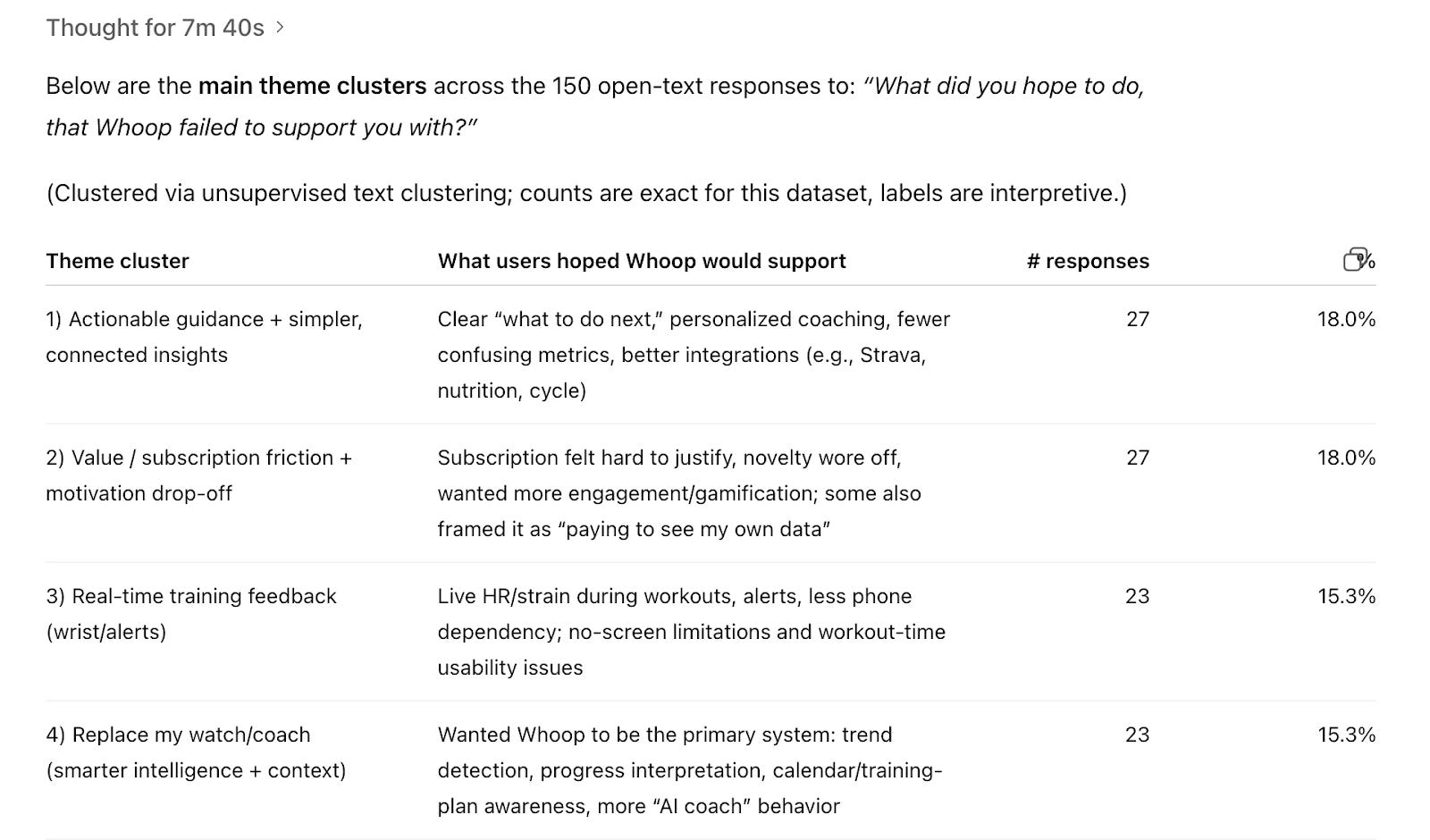 I asked ChatGPT to find me theme clusters and counts for the churn survey question “What did you hope to do that Whoop failed to support you with?”