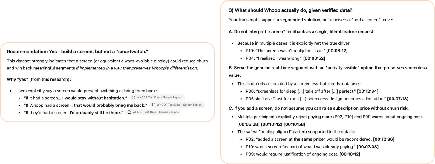 The right output does something harder. It challenges the surface-level request (“Do not interpret screen feedback as a single, literal feature request”), segments users by actual need, and flags pricing risk with specific participant timestamps you can verify. It’s messier and doesn’t oversimplify things, but it’s real.