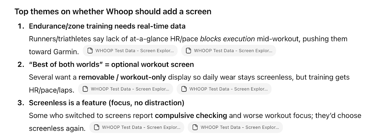 The results below are clusters that don’t help us make this decision either. So 18% of churned respondents need “more actionable guidance,” which sounds like a job-to-be-done. But there are too many possible directions within that cluster for us to make a decision more easily. Should Whoop focus on clearer metrics or workout plans, or both? Plus, most of this has nothing to do with our screen decision.
