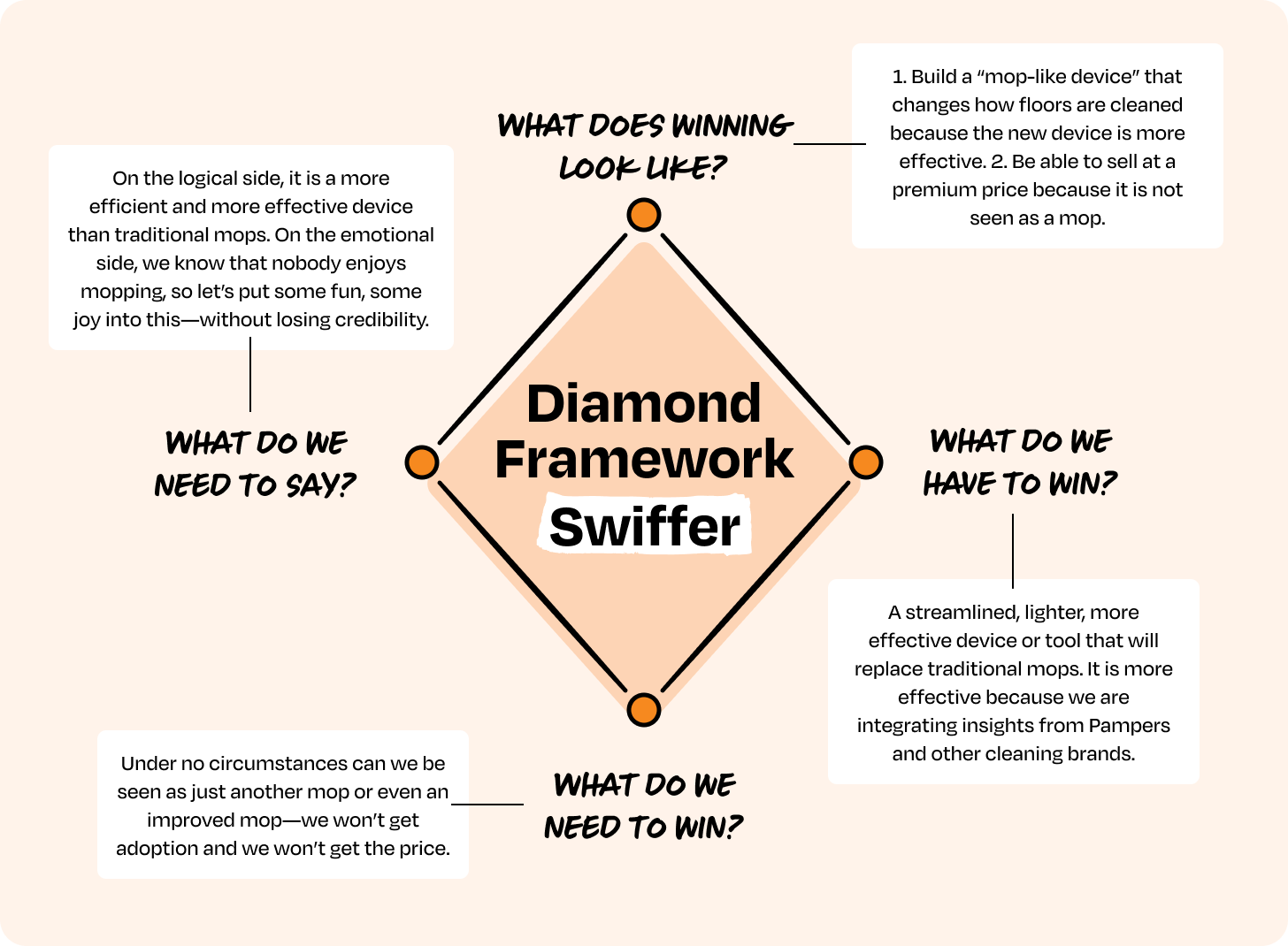 We reframed the problem around fun, eliminating names like “Promop” or “EffiClean.” One small team explored toys, other exotic vacations, and other easy-to-use tools. Our linguists focused on the actions and sounds of cleaning—sweeping, wiping, washing. When we merged the work, “Swiffer” sat in the middle.