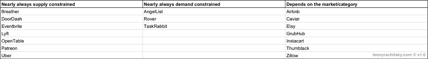 Side-note: What does being supply-constrained or demand-constrained even mean? It simply means that your biggest constraint to driving additional transactions is a lack of supply (e.g. Airbnb Homes, Uber drivers) or a lack of demand (e.g. Rover dog owners, TaskRabbit customers). In theory, you always want more of both, but in many cases adding more of one side doesn’t actually lead to growth. Your resources are better spent elsewhere.