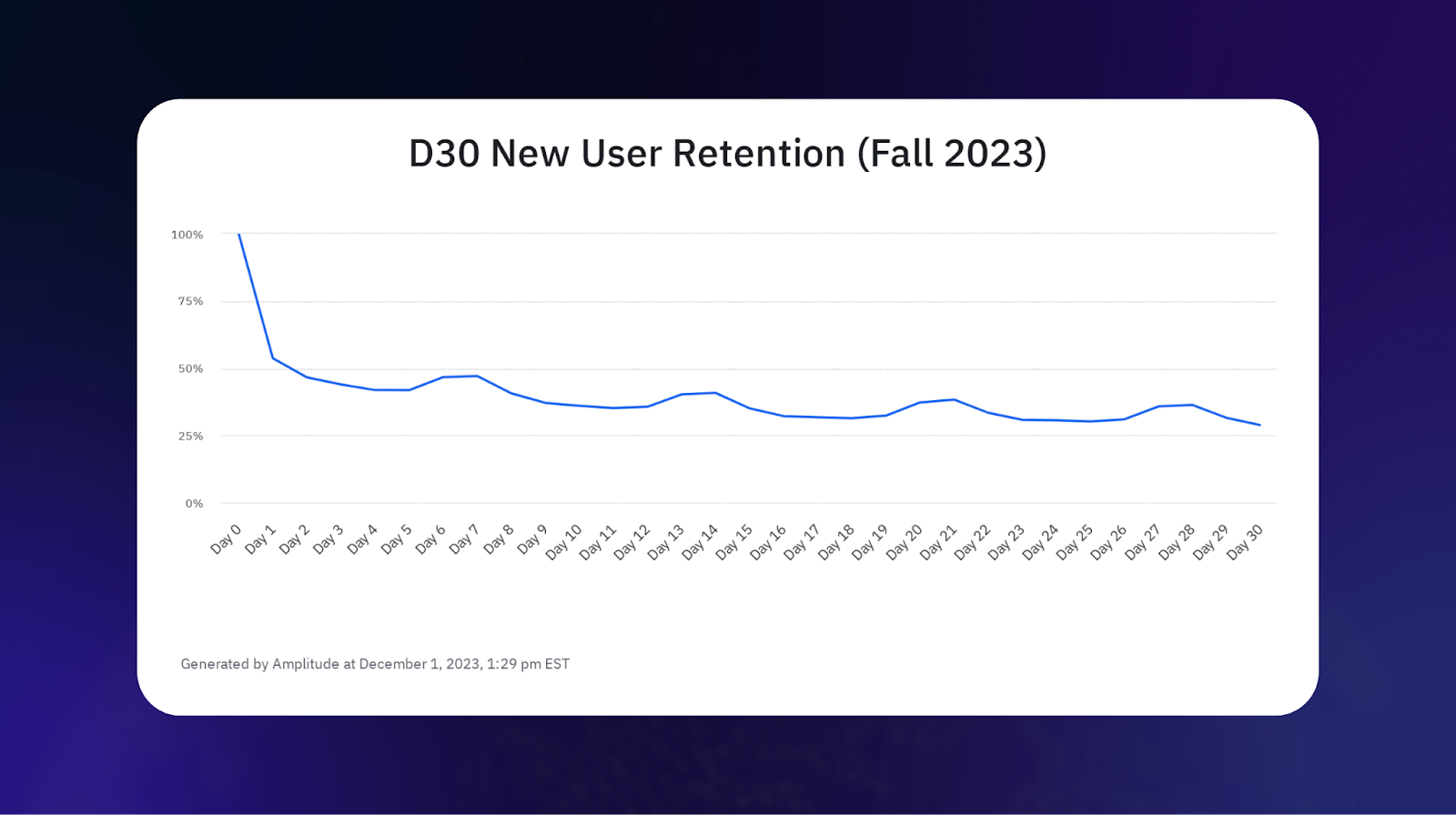 For context on D30 retention, all of Snap, TikTok, Twitter, and Facebook have D30 new-user retention between 28% and 40% (source). Ours is currently in the mid-30s.