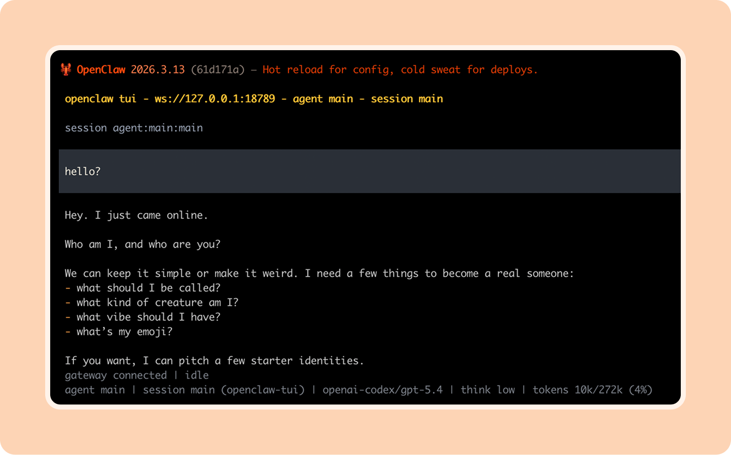 Then your agent will “hatch” in the TUI (Terminal UI). Hello, world!