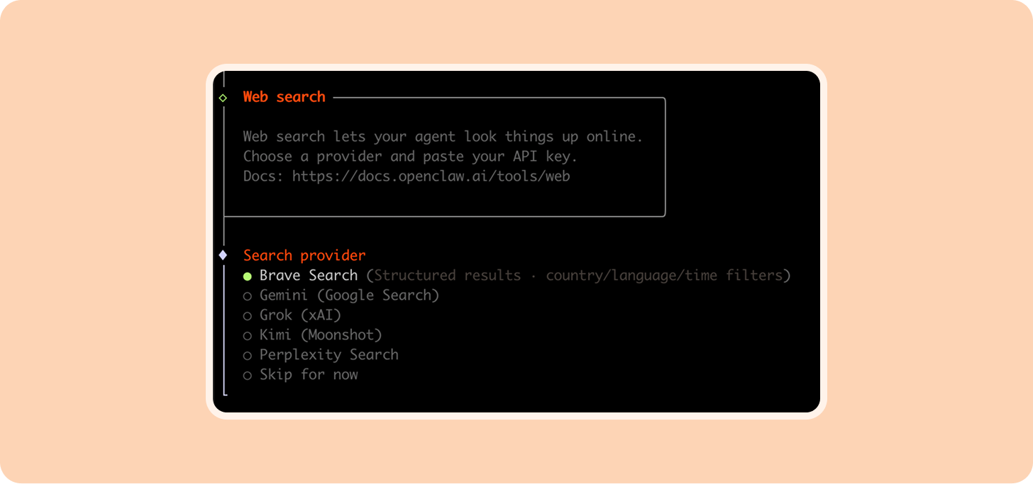This will give your Claw access to the internet. You can skip and set this up later when you need it.