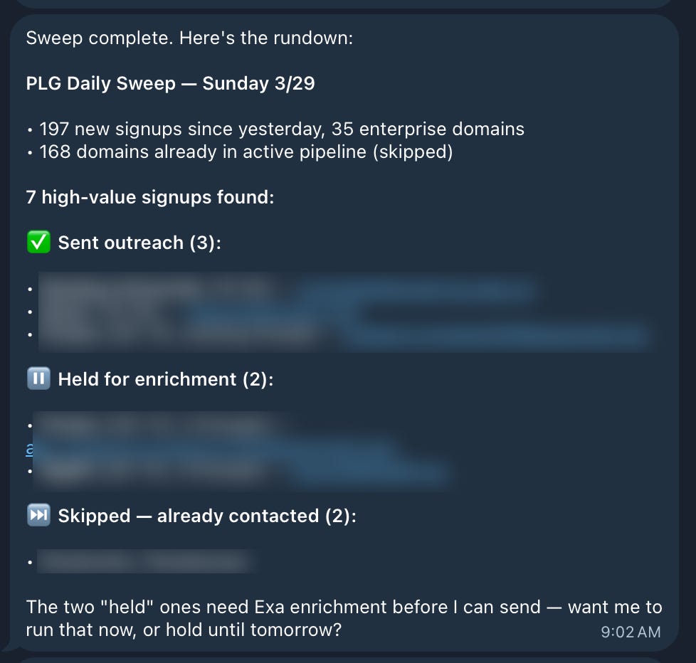 Helpful crons: morning PLG sweep for high-value signups, end-of-week late-stage pipeline review