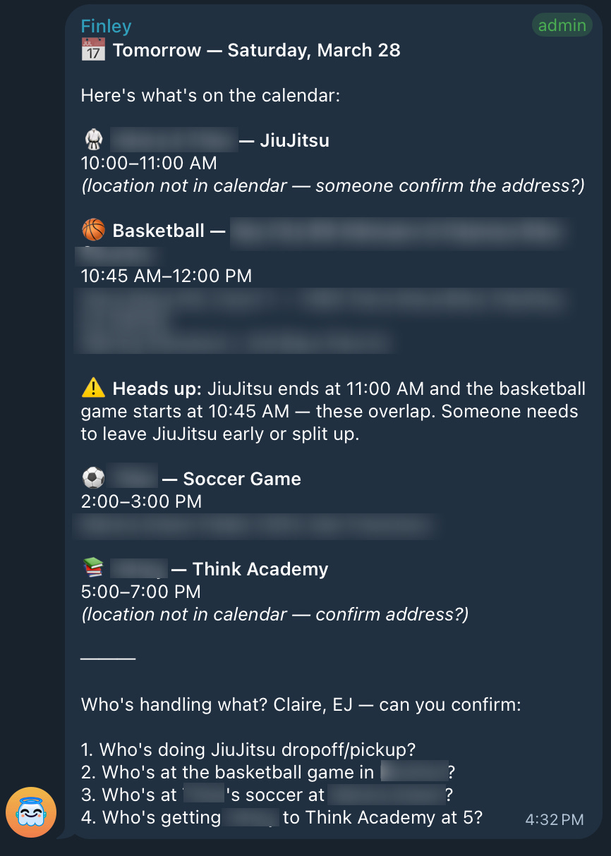 Helpful crons: afternoon logistics check (who is picking up the kids?), weekend planning (how do we make it to all the birthday parties and soccer games?)