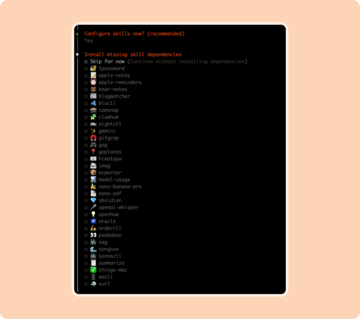 If you’re not familiar with working in the terminal, the onboarding process is a little confusing. Use arrow keys to navigate up, down, left, and right, spacebar to select, and enter to submit.