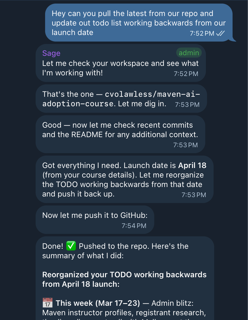 Is it perfect? No. Polly still occasionally gets confused about time zones. Sam will sometimes draft a sales email I have to rewrite. AI still isn’t very funny. Crons break, and I say “hellooo?” into the void more than I’d like to admit.