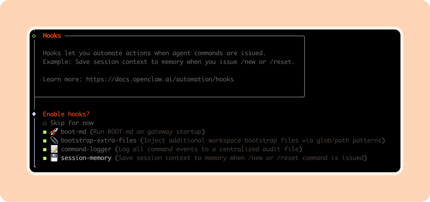These are helpful tools that keep your OpenClaw setup optimized. I turned on all four of these, but session memory is the most important. The others are helpful when you want to debug or optimize your agent.