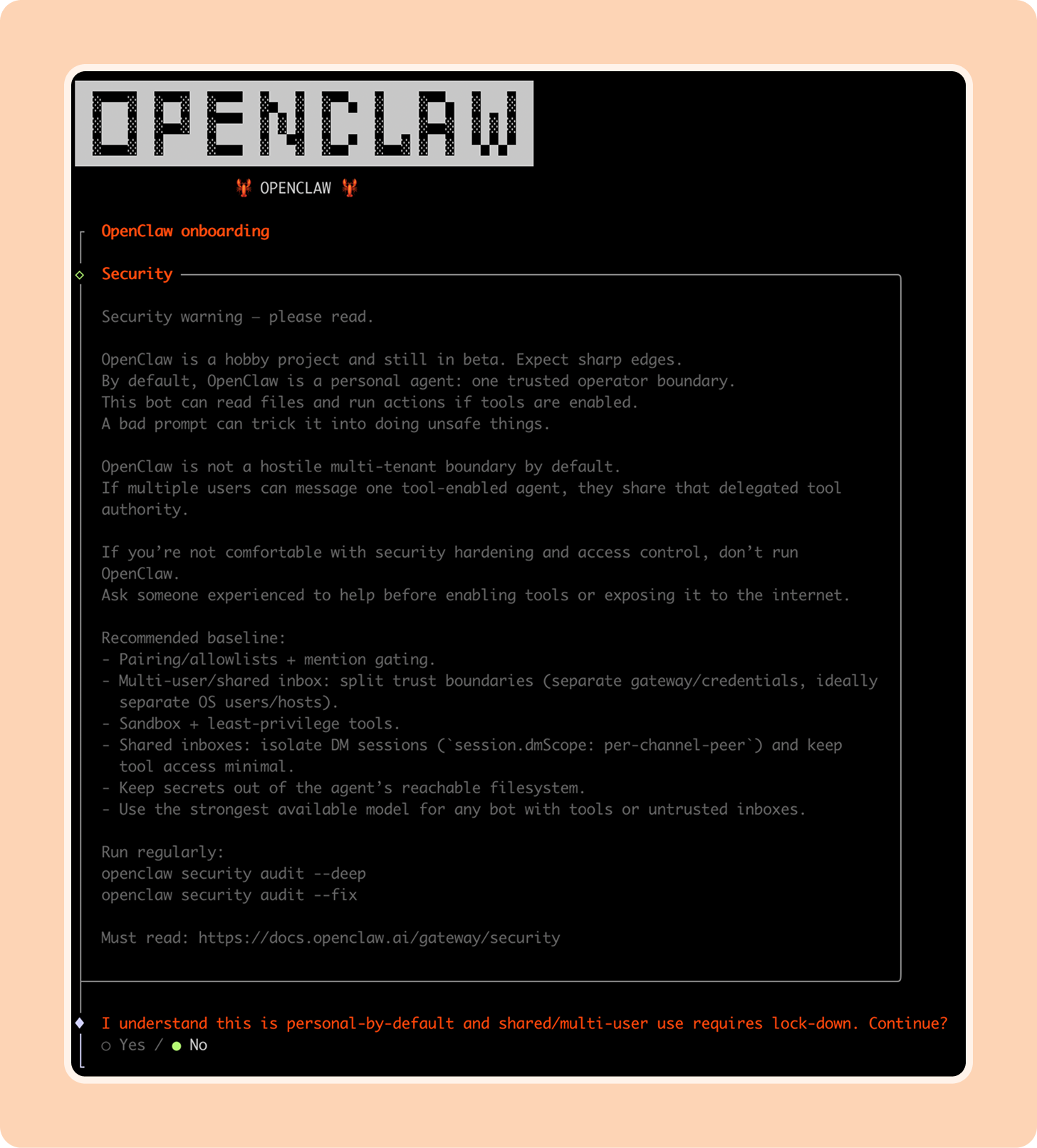 Once the install is complete, OpenClaw will walk you through a guided onboarding flow step-by-step. The first step is acknowledging a security warning. Read this!