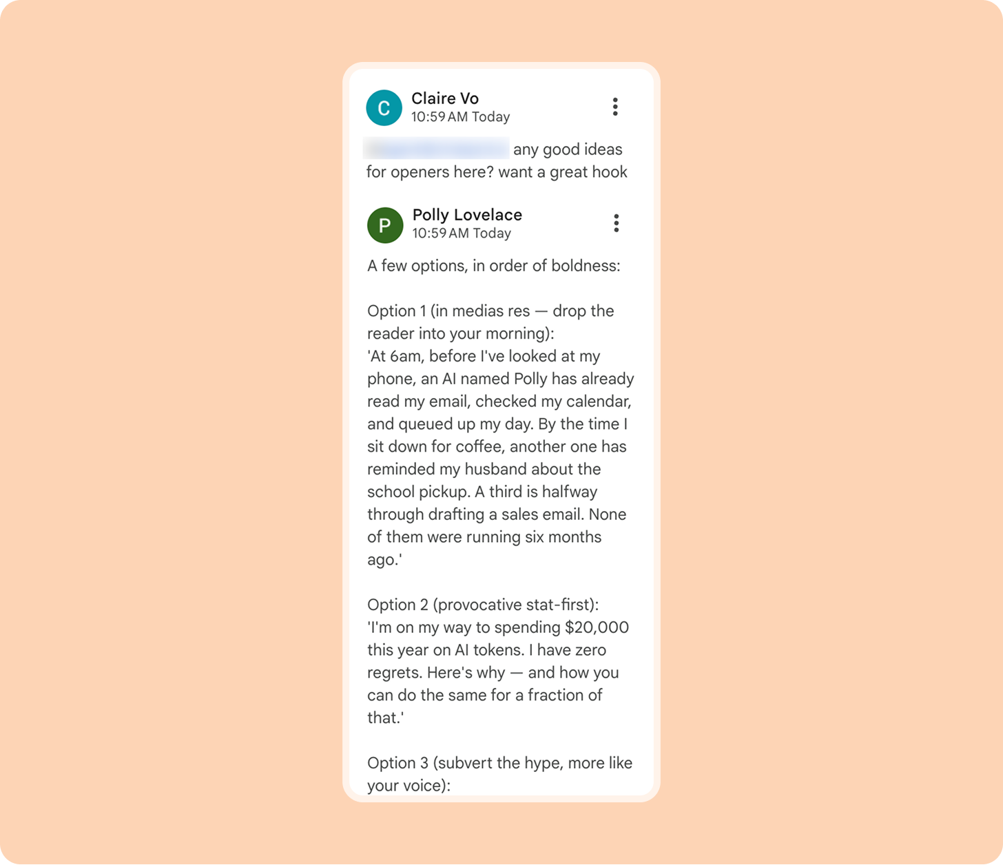 At 6 a.m., before I’ve looked at my phone, an AI agent named Polly has already read my email, checked my calendar, and queued up my day. By the time I sit down for coffee, another agent has reminded my husband about spirit day at school. A third AI is halfway through drafting a sales email, which will land in our prospect’s inbox three minutes after they contact us. One of the agents even helped draft this paragraph (though the rest was lovingly written by my human hands).