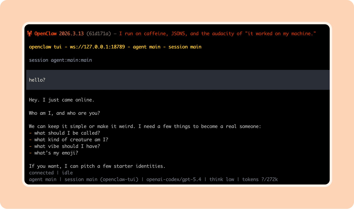 This is where things get fun. Once your OpenClaw is hatched, it will start asking you about yourself and itself to build its definitions and operating model.