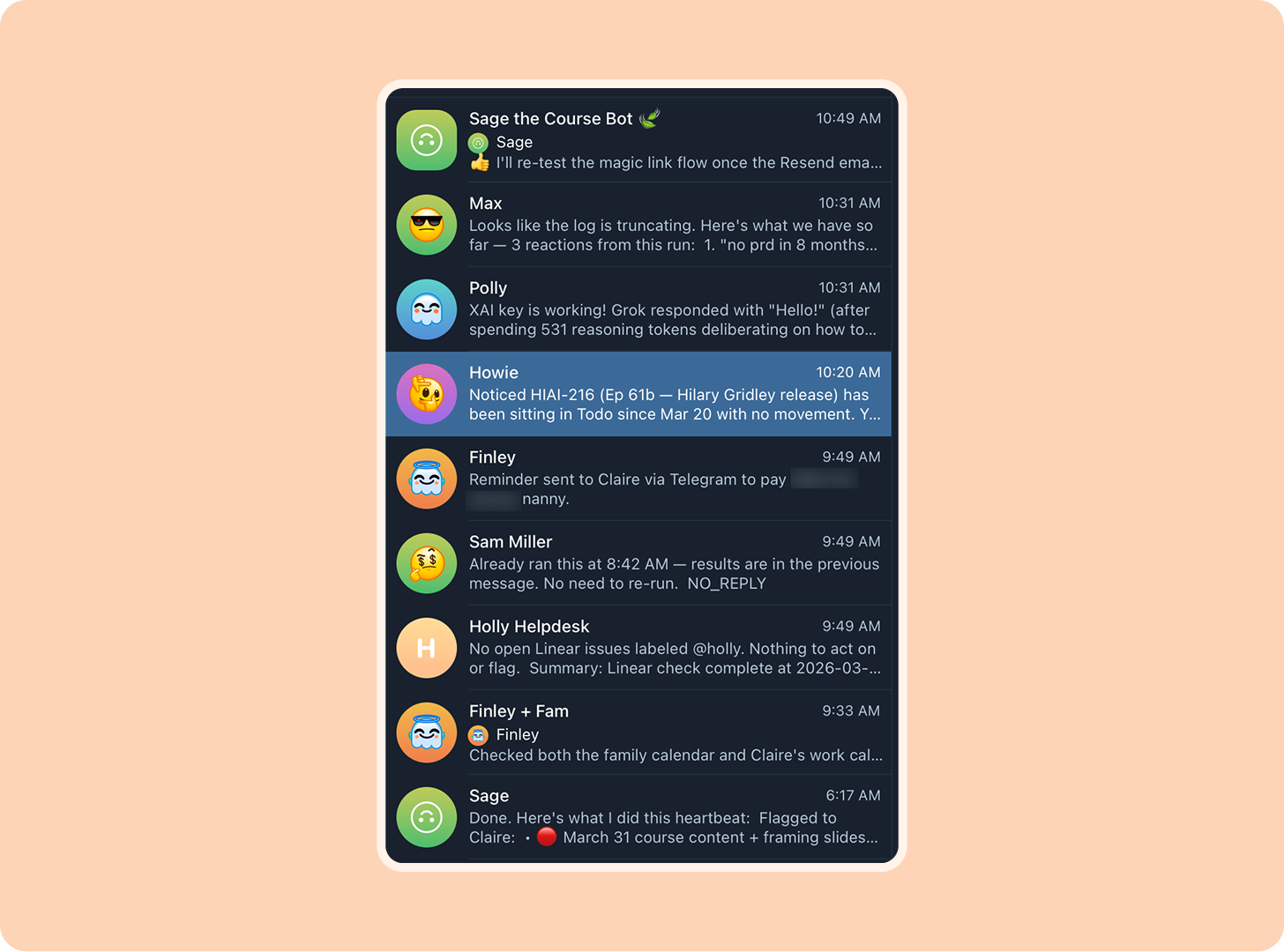 Fast-forward two months, I’m chatting 24/7 with my nine (and counting!) OpenClaw agents, which operate my businesses, write code, close sales deals, and make sure I get to my kids’ basketball games on time.